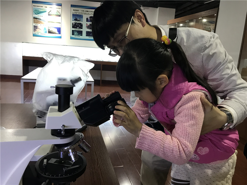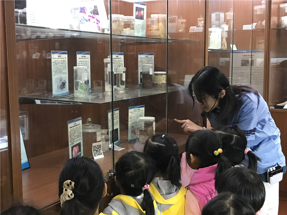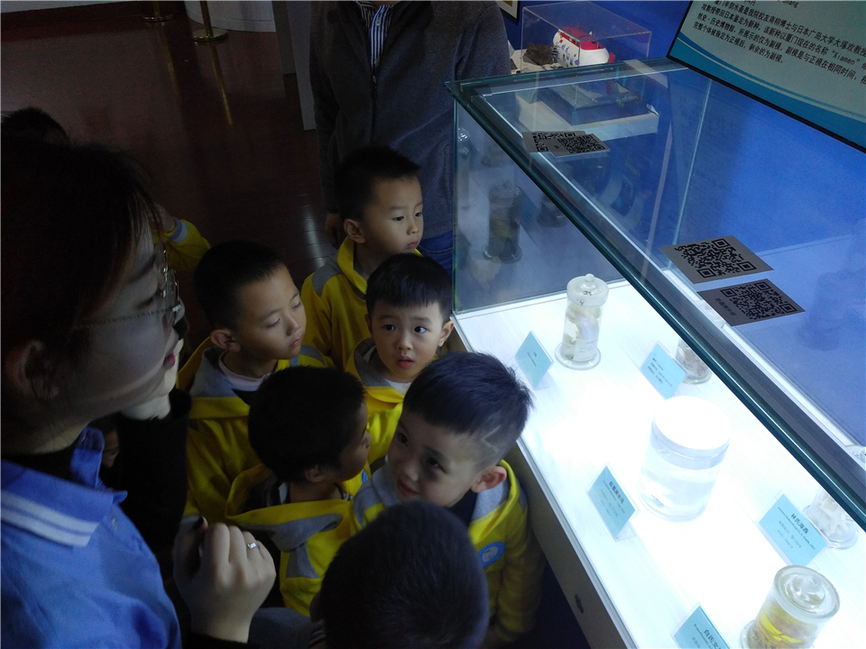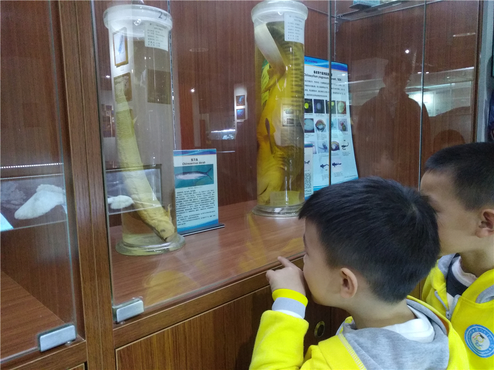 从综合展区出来,大家来到了海洋生物展区,顿时被琳琅满目的生物标本吸引住了。大小不一的瓶子里是长相各异的海洋生物,伴随着讲解员的介绍,孩子们也渐渐敞开想象的空间,天马行空地各抒己见。瞧,安亭候盯着眼前的宝刀鱼标本,振振有词地和大家分享:“它在做鬼脸诶”,然后自己也兴奋地摆了个同款鬼脸。