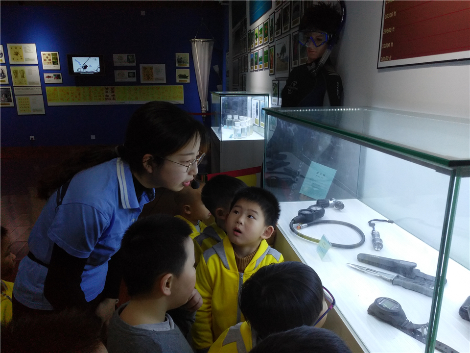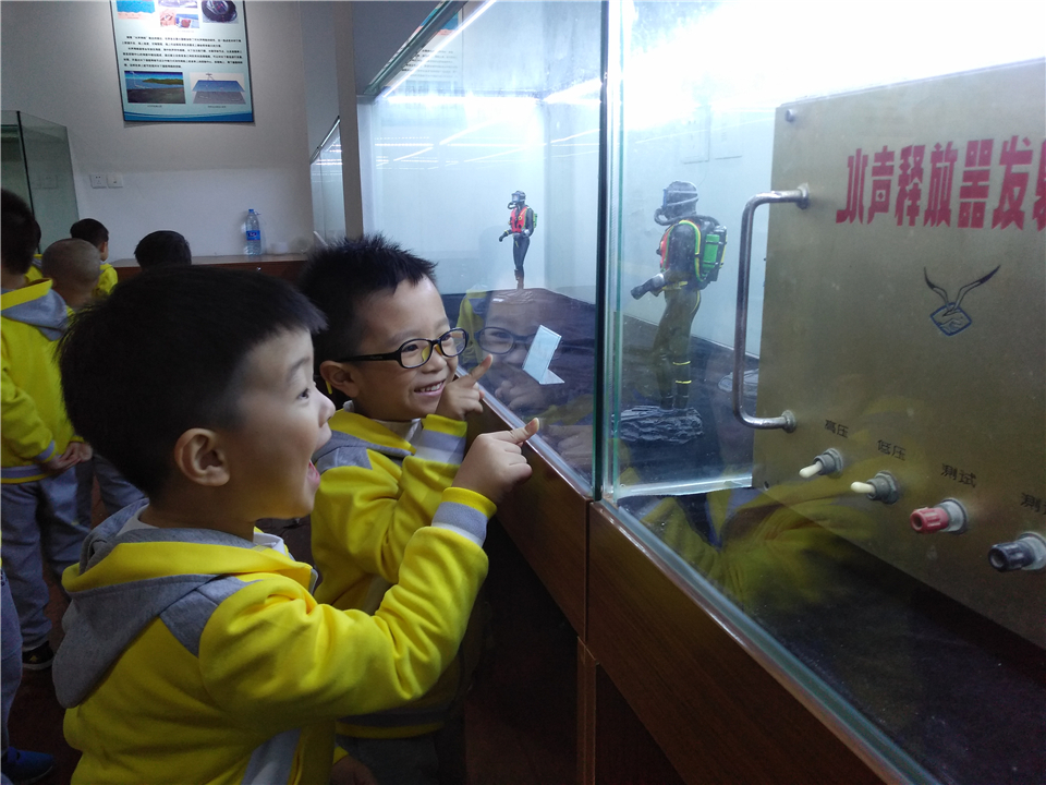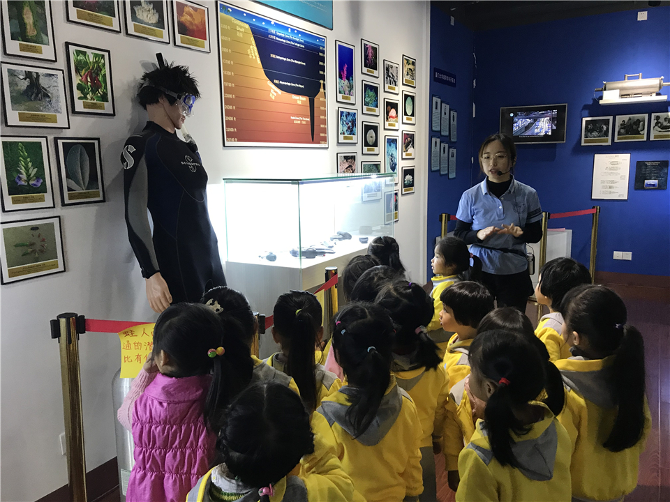 孩子们在一旁发现了一个潜水员模型,开心极了。通过讲解,大家对蛙人面具等潜水设备有了新的认识。