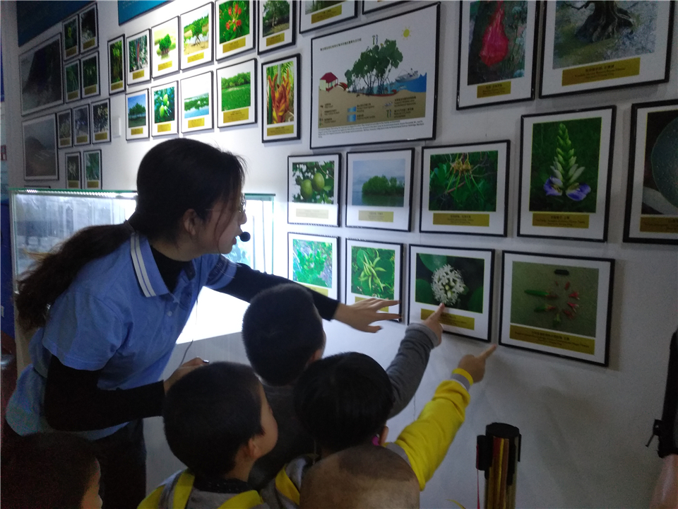 综合展区的墙面上挂满了大大小小、形形色色的相片,孩子们迫不及待地指着相片开启了“十万个为什么”。于是讲解员用通俗易懂的方式向孩子们介绍了“红树林”、“潮间带”。