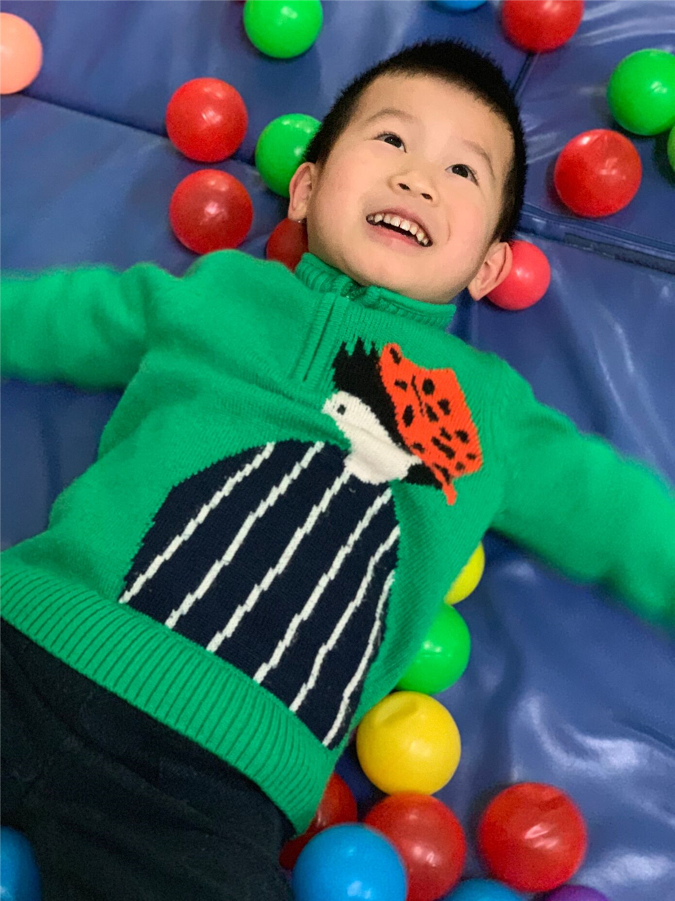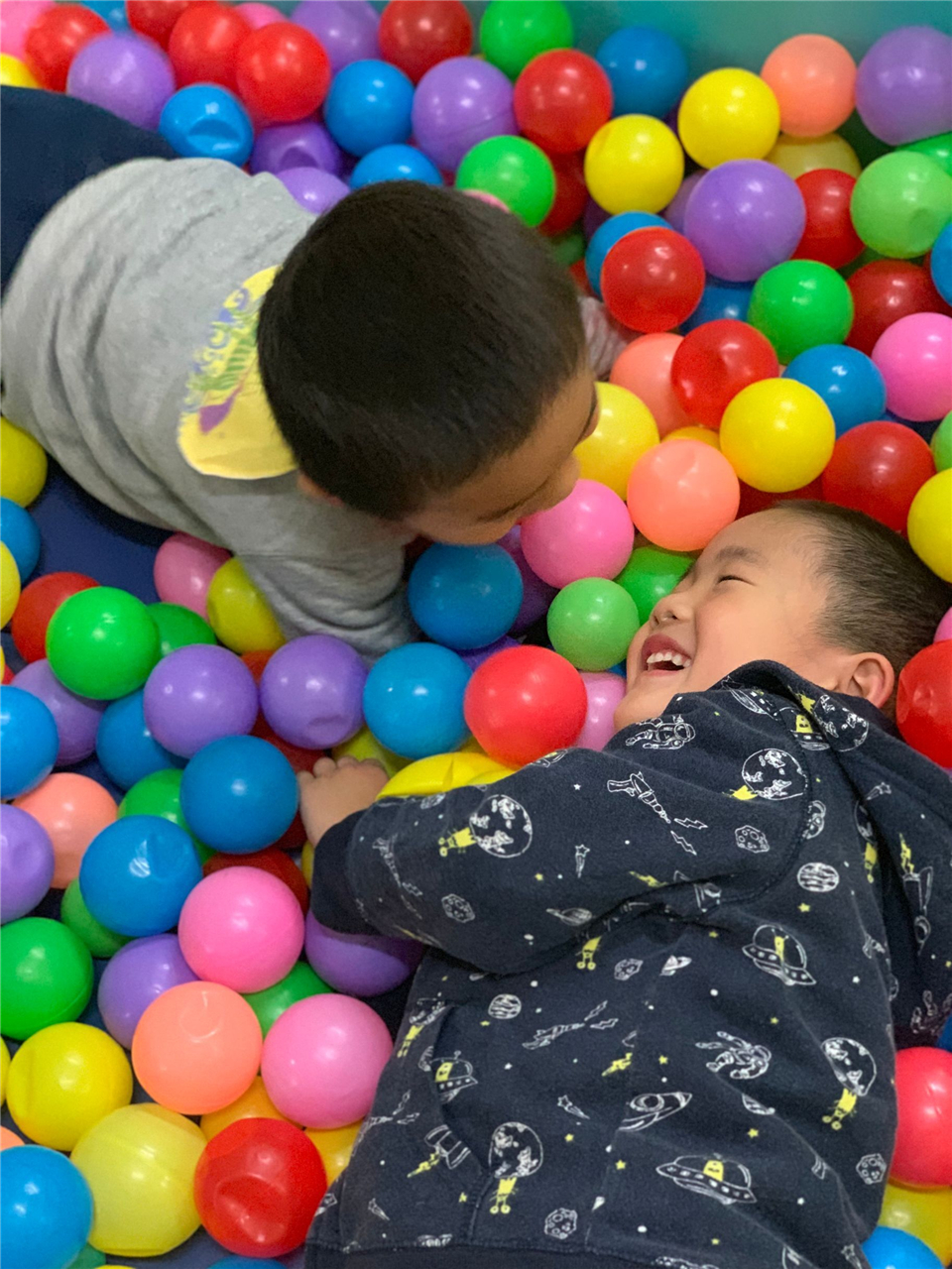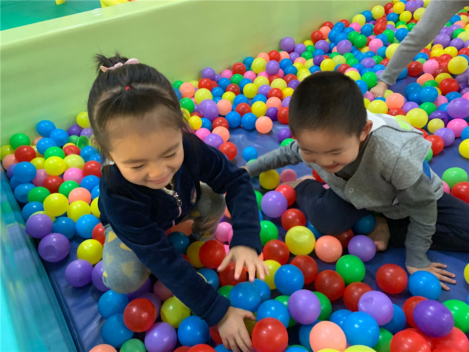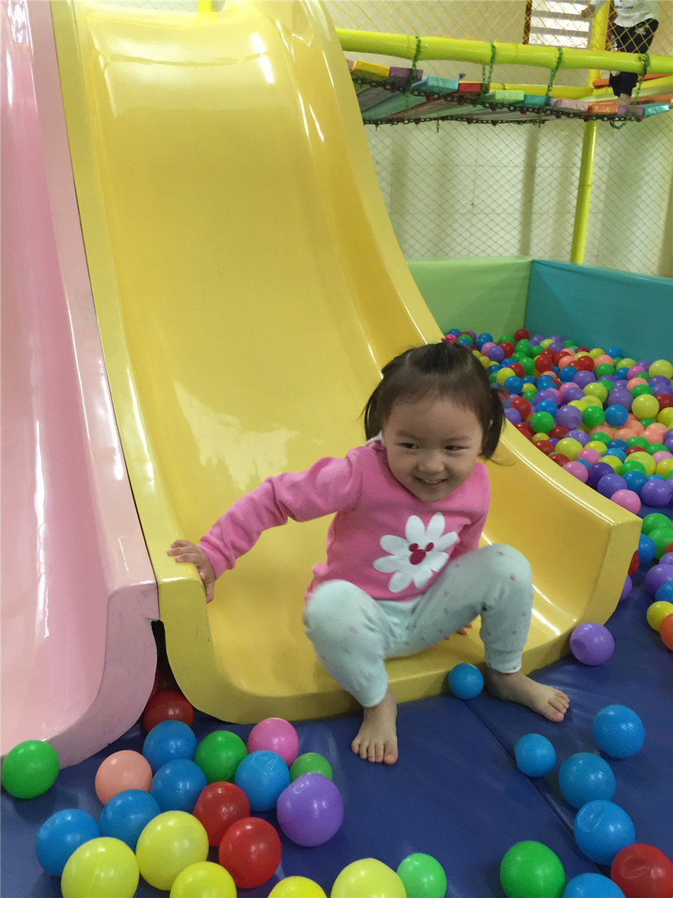 咻!一下子迎来了海洋球的拥抱,真开心!
