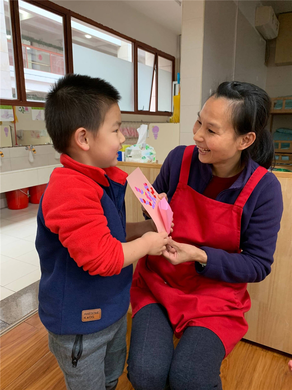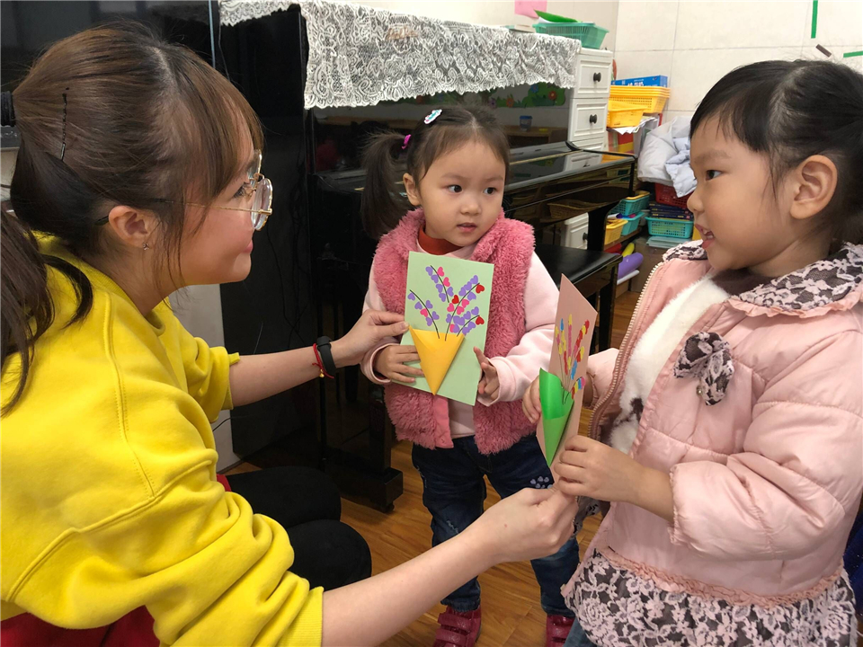 瞧呀!萌娃们已经迫不及待地将自己手中的贺卡送给老师了呢!