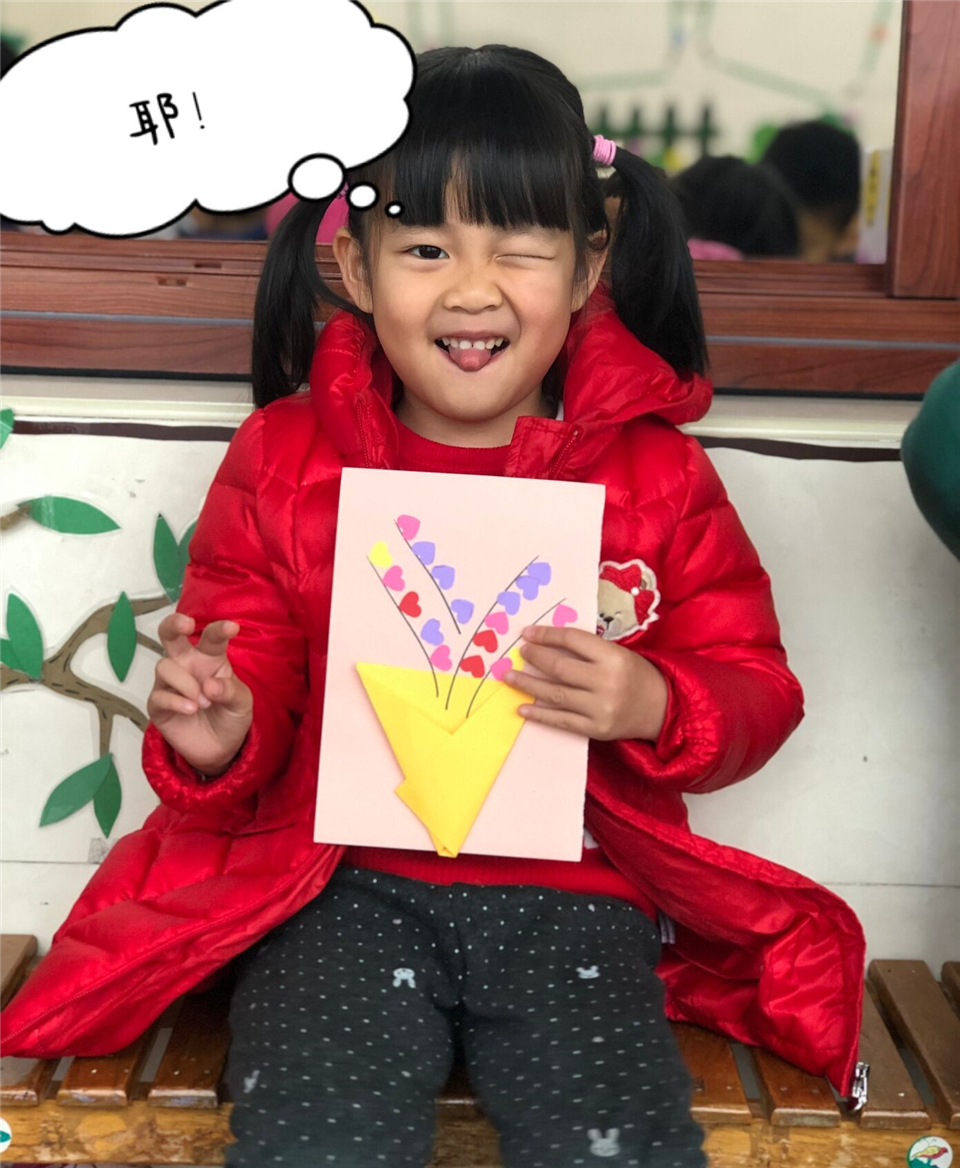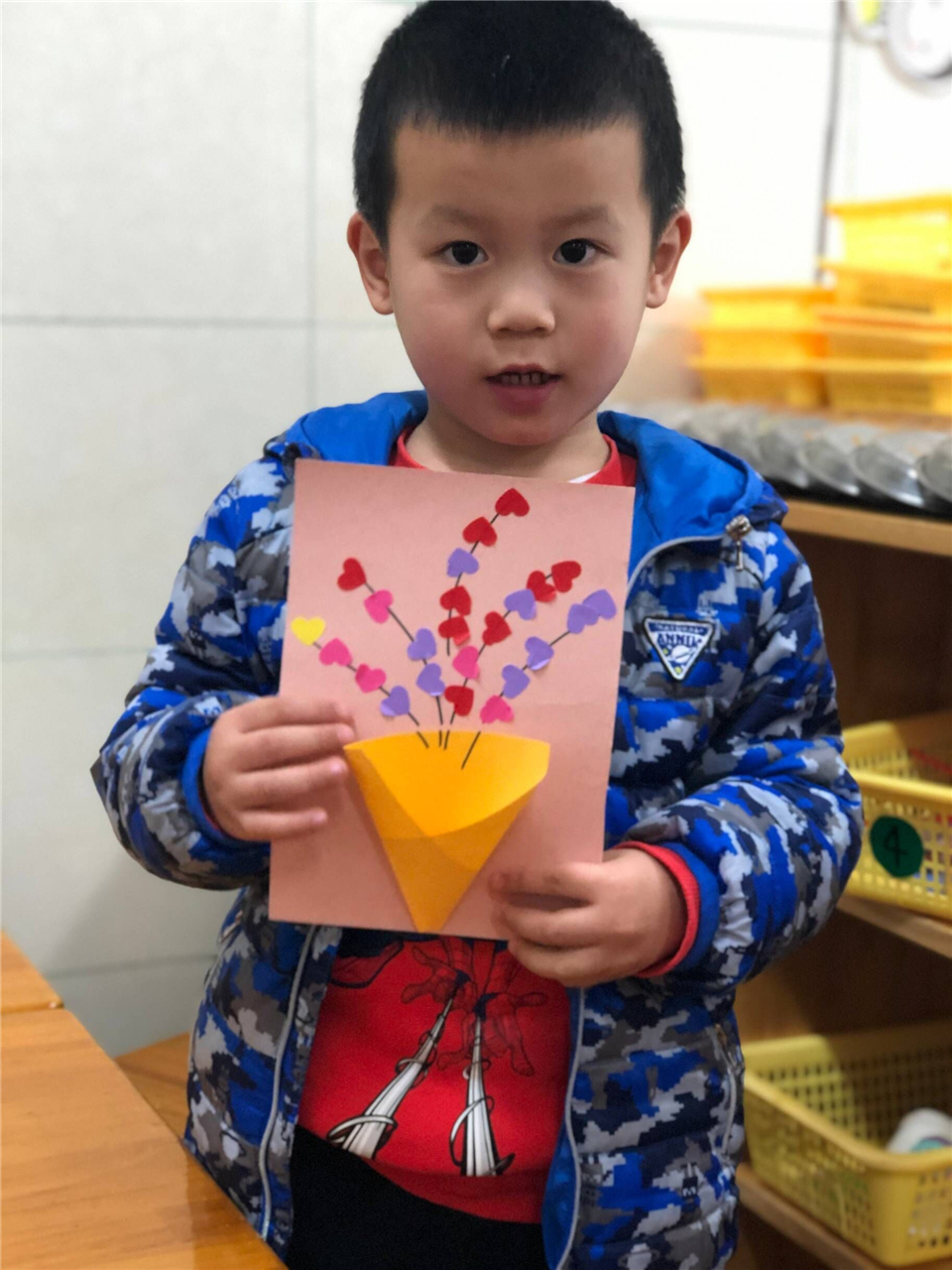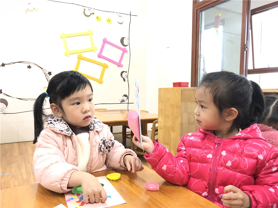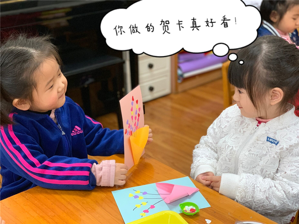 不一会儿,萌娃们的贺卡便制作好了!瞧,他们满脸自豪地将自己的贺卡跟身边的好伙伴分享,互相欣赏了起来。
