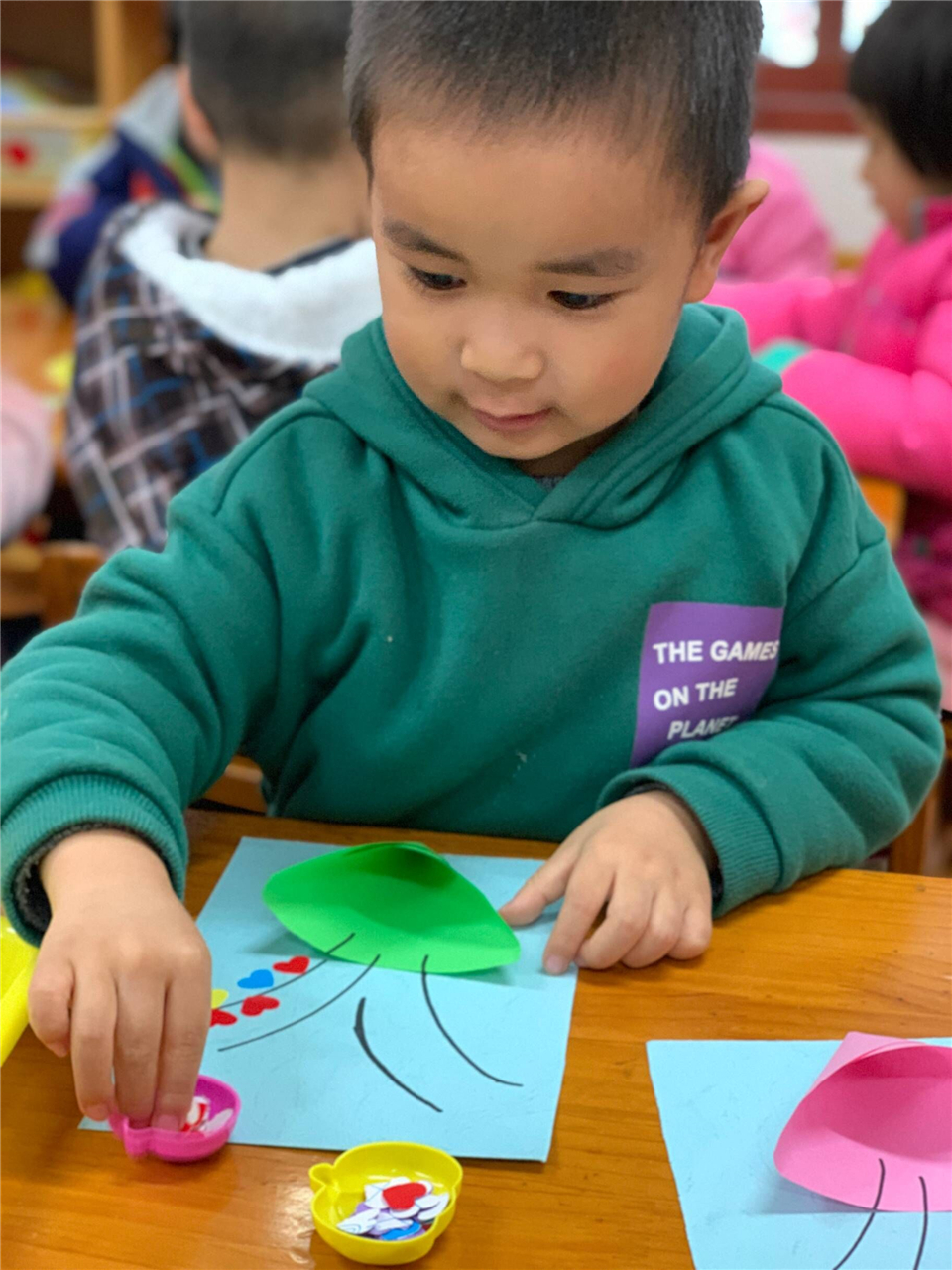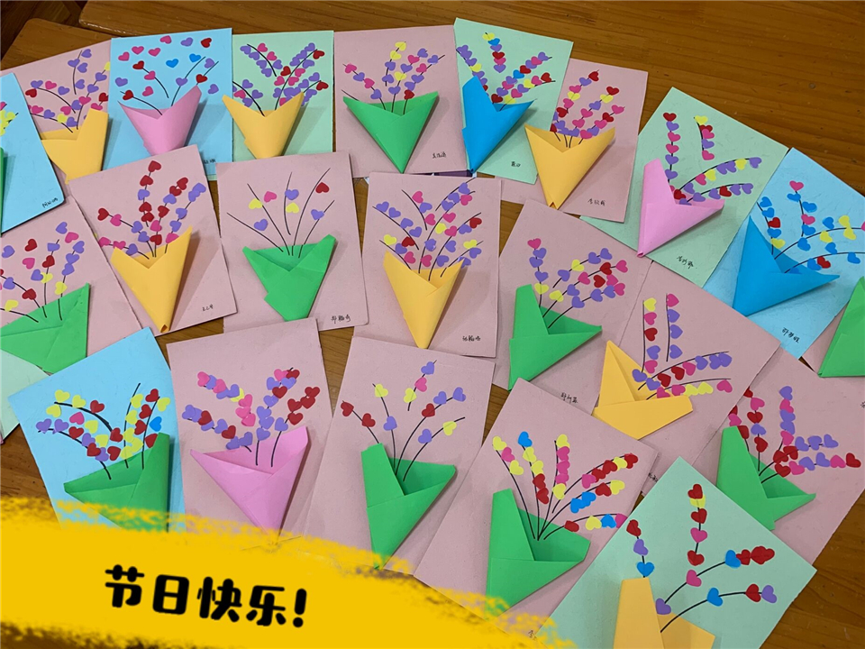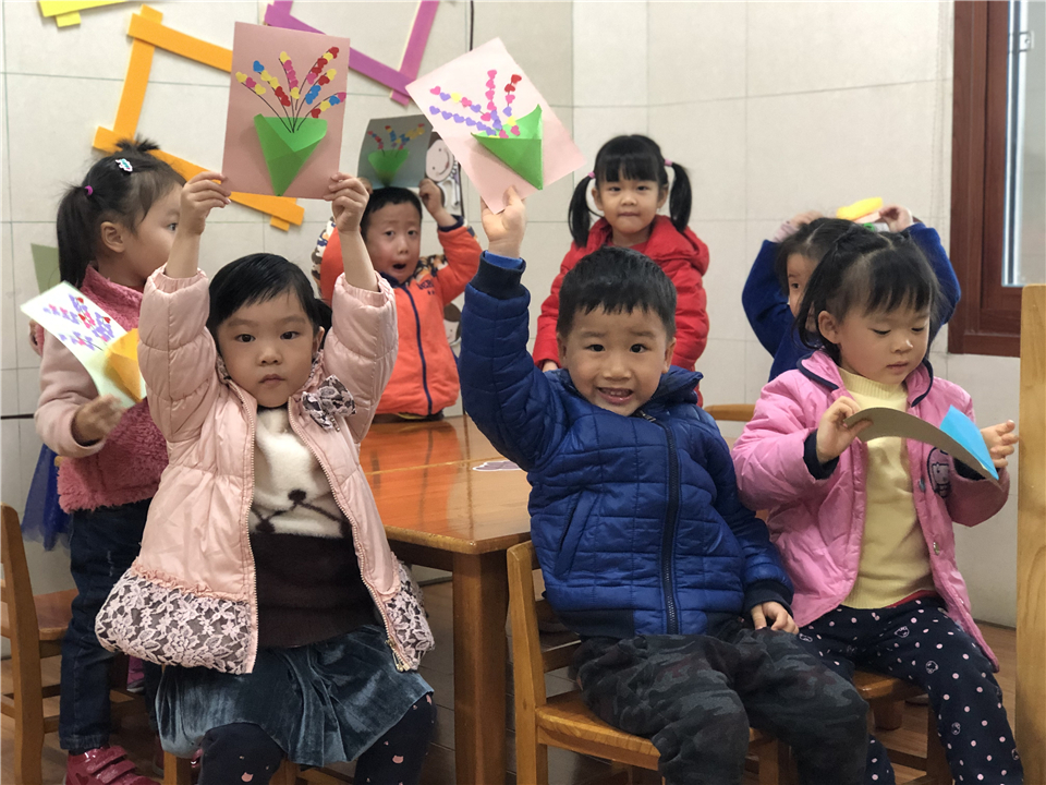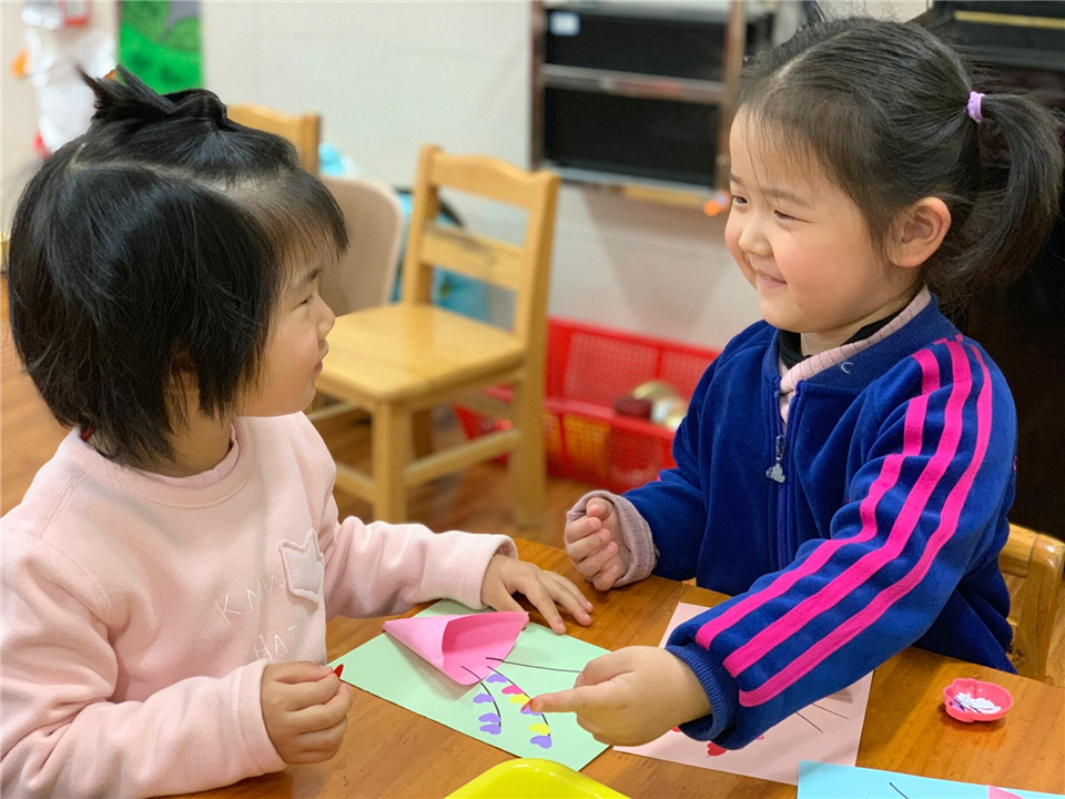 不一会儿,萌娃们的贺卡便制作好了!瞧,他们满脸自豪地将自己的贺卡跟身边的好伙伴分享,互相欣赏了起来。