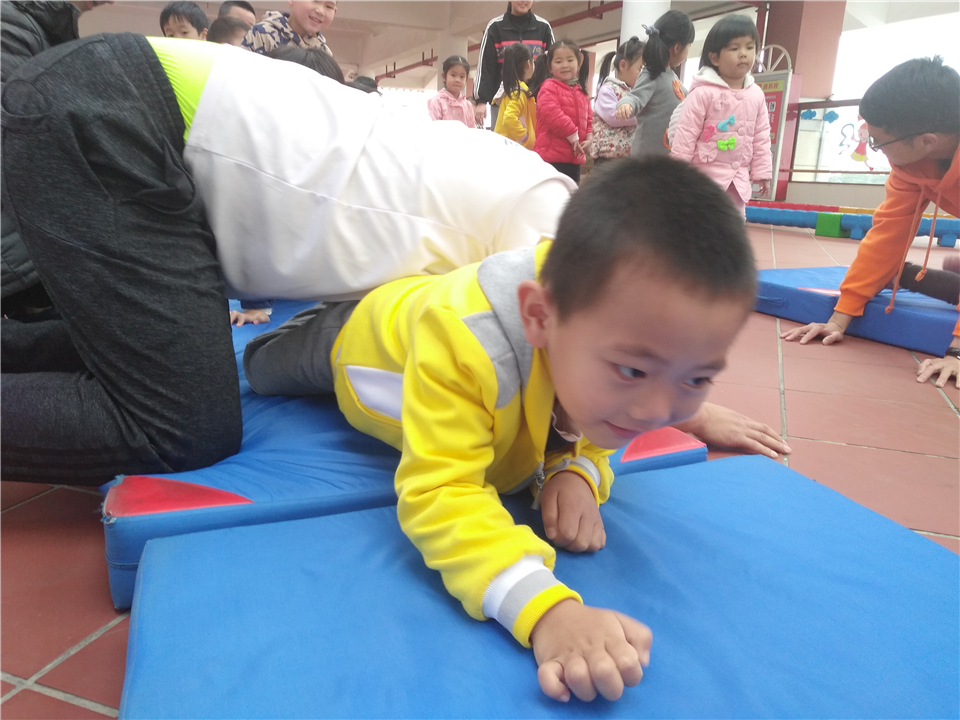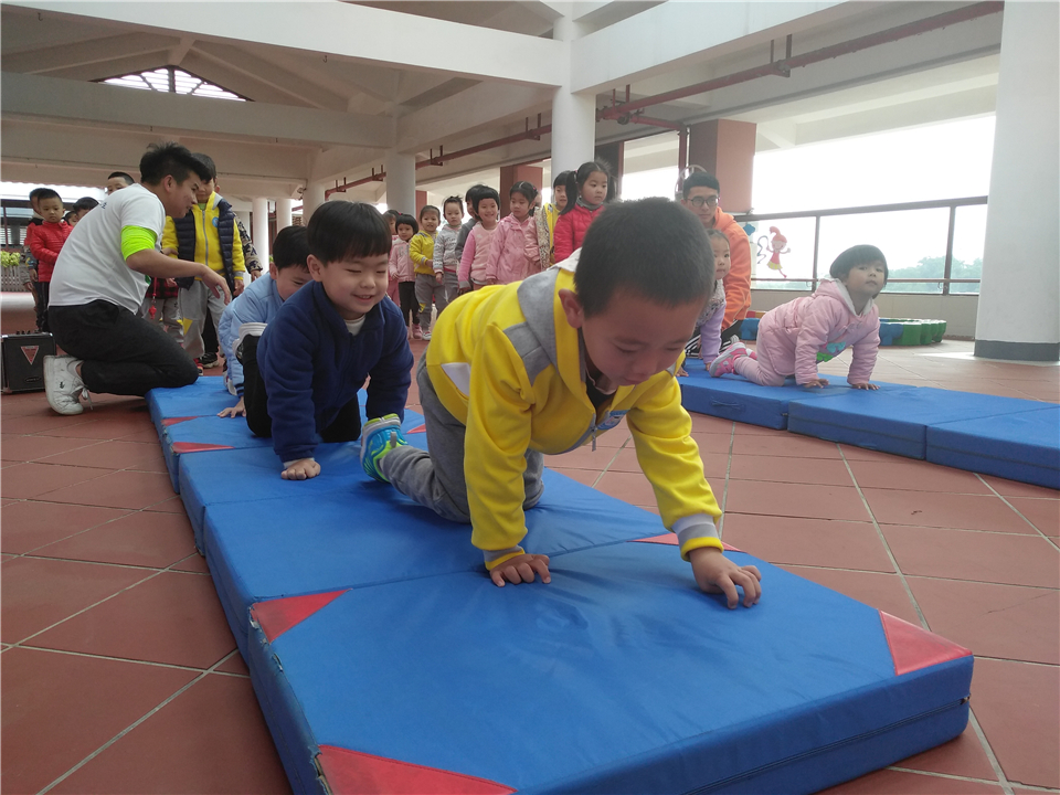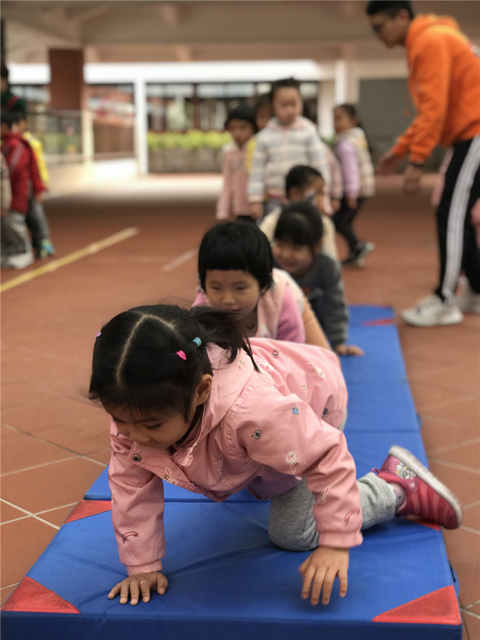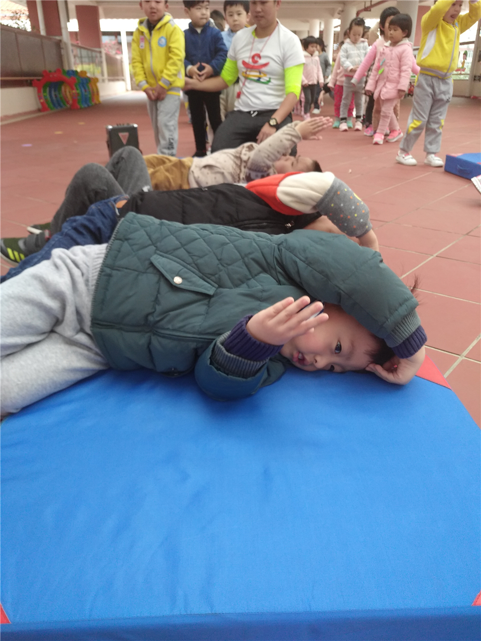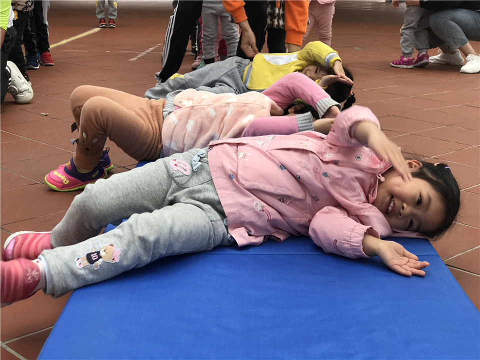 怎么样变成“毛毛虫”呢?小虎哥哥做了一个示范,趴在垫子上,撅起屁股,用手和膝盖向前爬过垫子到达目的地。音乐响起,小“毛毛虫”们出发啦。大家相互观望和加油,敏捷地闯过了第一关。