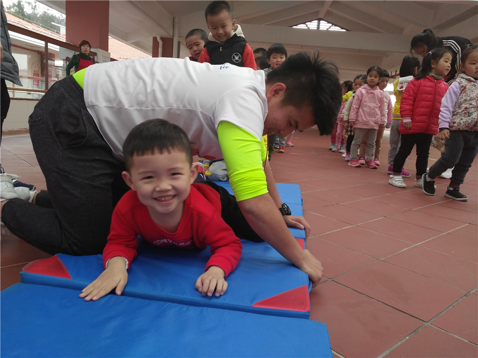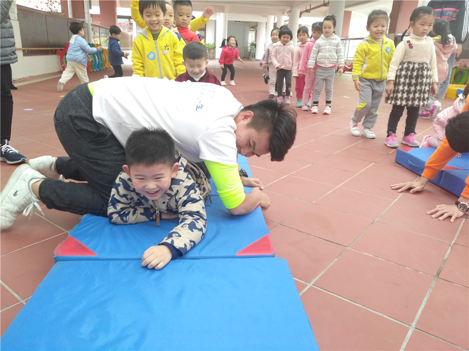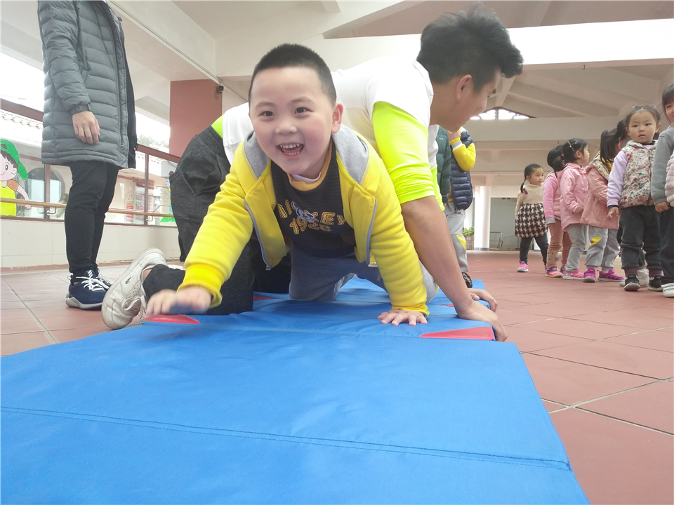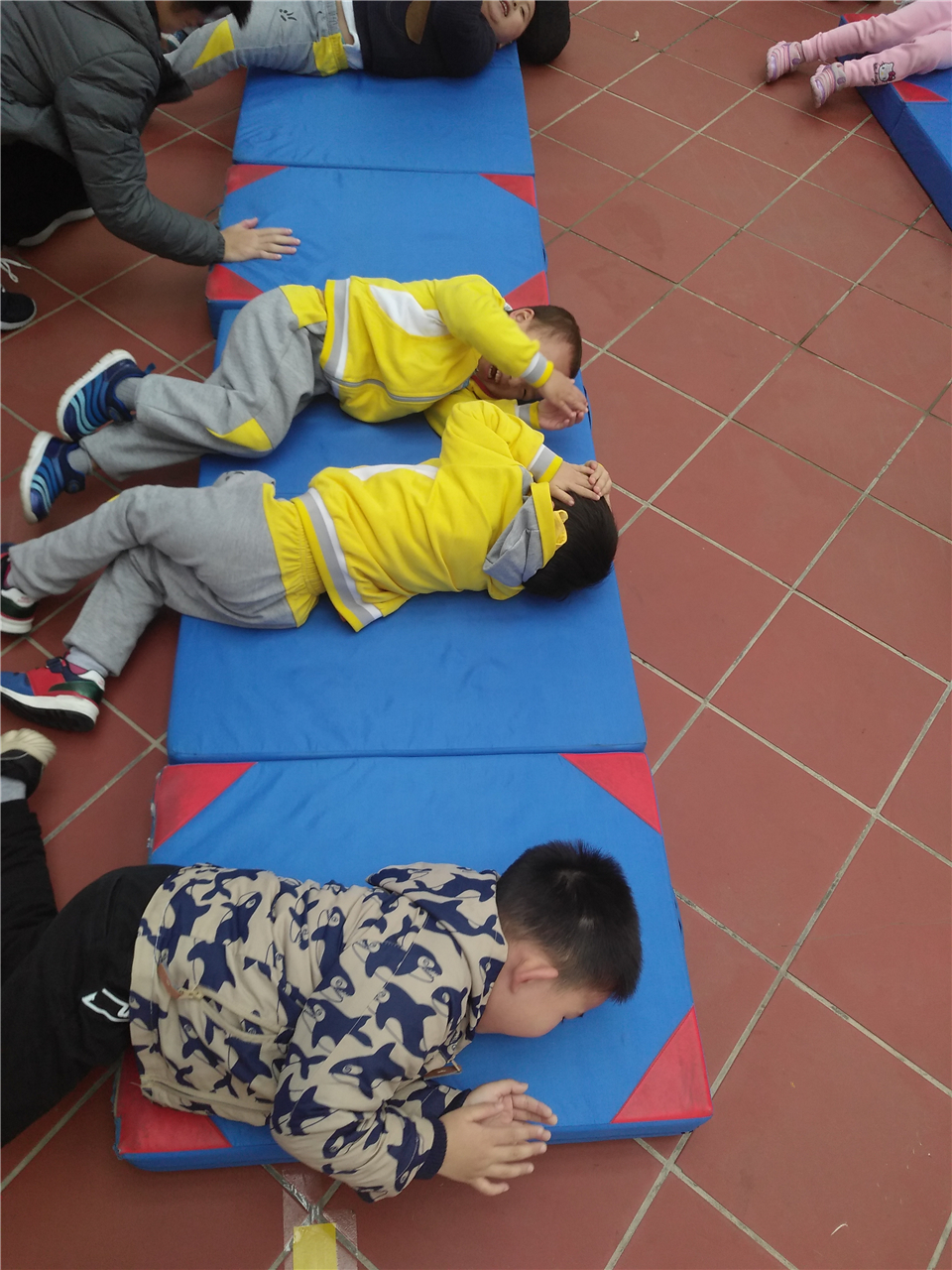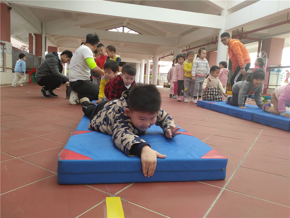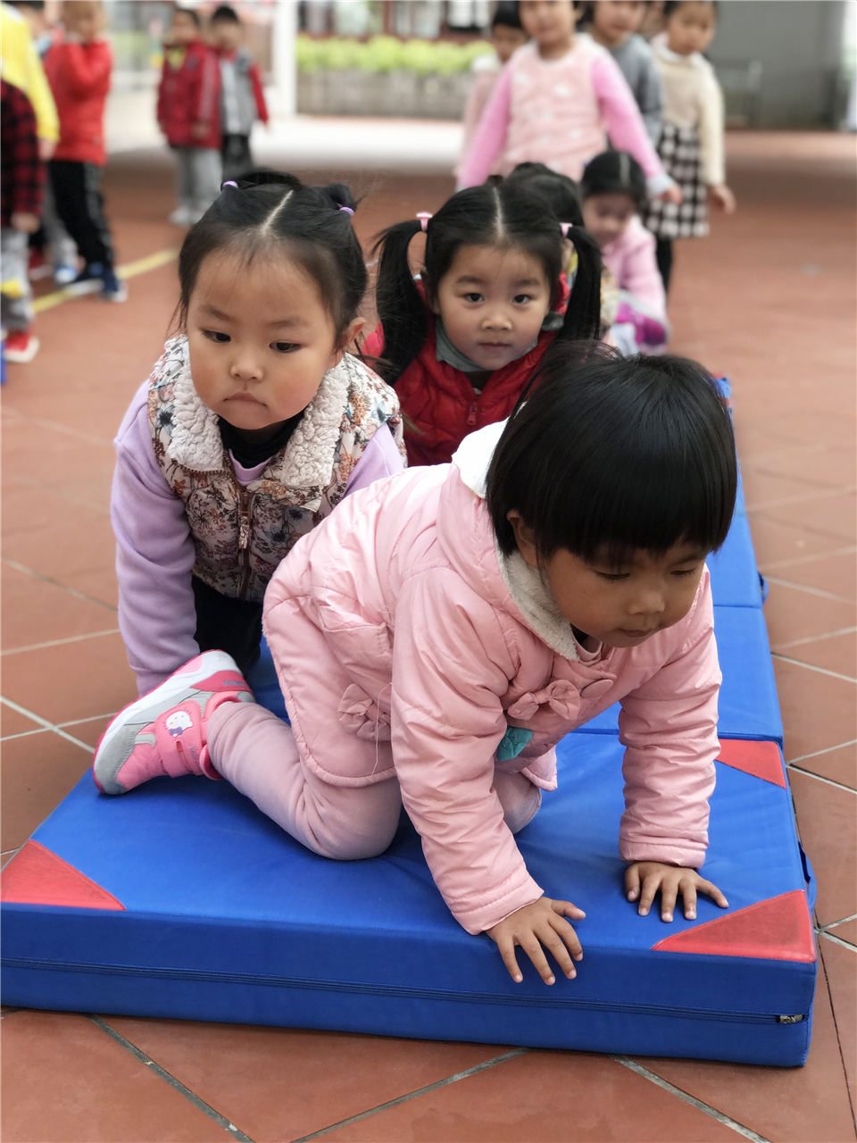怎么样变成“毛毛虫”呢?小虎哥哥做了一个示范,趴在垫子上,撅起屁股,用手和膝盖向前爬过垫子到达目的地。音乐响起,小“毛毛虫”们出发啦。大家相互观望和加油,敏捷地闯过了第一关。