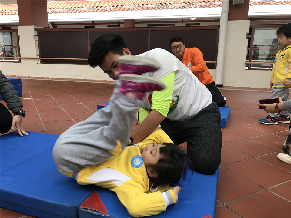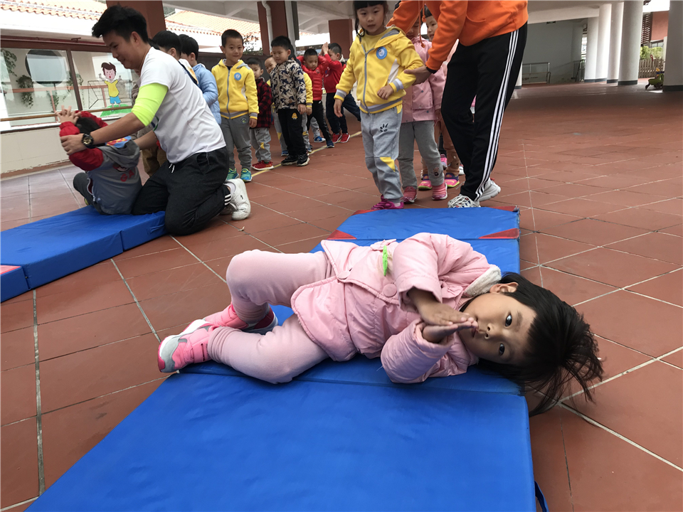 大家欢呼雀跃了一番,激动之余,稍作调整,第三关挑战之“翻滚吧,毛毛虫”开始啦。有了前面两关的成功经验,在看完小虎哥哥的示范之后,孩子们已经摩拳擦掌,跃跃欲试了。瞧,“毛毛虫们”先后进入了两种不同的翻滚模式,闯关进入到了高潮迭起的状态,“嗨”翻了,“萌”翻了!