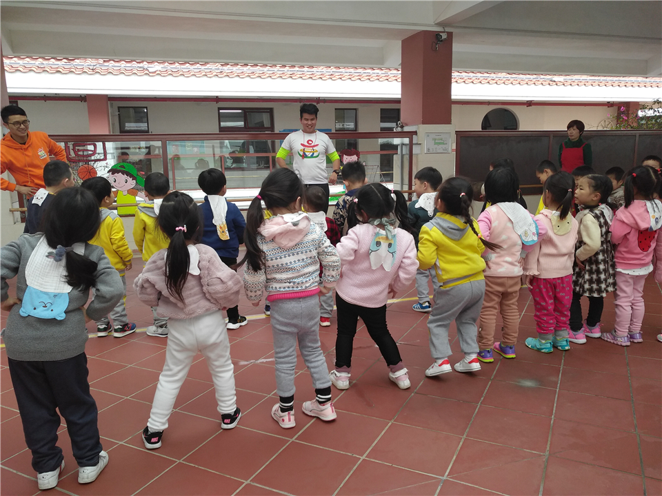 孩子们逐渐和小虎哥哥熟络起来,小虎哥哥突然跑到各个方向,大声问:“我在哪里?”孩子们不约而同地用手开心地指着小虎哥哥大声回答:“你在这里”……就这样,热身开始了。在愉快的氛围下,孩子们很快就掌握了小虎哥哥的小哨子和口令代表的意思。