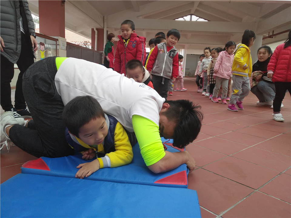 集体的成功闯关让大家信心满满,正在大家手舞足蹈的时候,第二关挑战之“毛毛虫过山洞”就开始啦,音乐响起,“毛毛虫”们要在小虎哥哥这座“大山”下,蜷缩身体,让自己钻过“山洞”。瞧,有的“毛毛虫”一开始不慌不忙,但在过“山洞”时突然变得“举步维艰”,但是一直用力地往外钻,最终成功地通过了考验,有的“毛毛虫”则采取速战速决的策略,轻松地钻过了“山洞”。