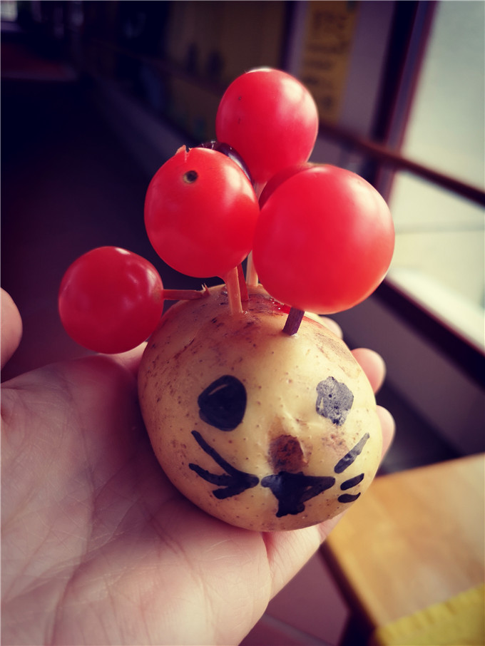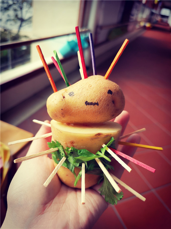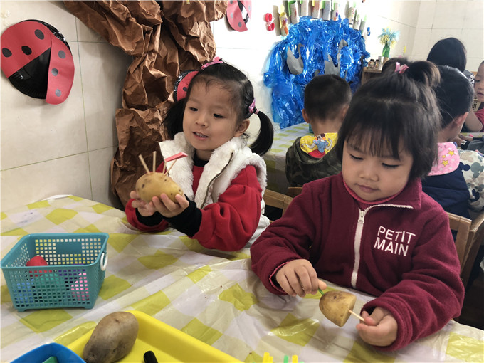 原来,土豆和牙签的妙用全在宝贝们的手上,土豆大变身之后成了一只只可爱的“小刺猬”。
