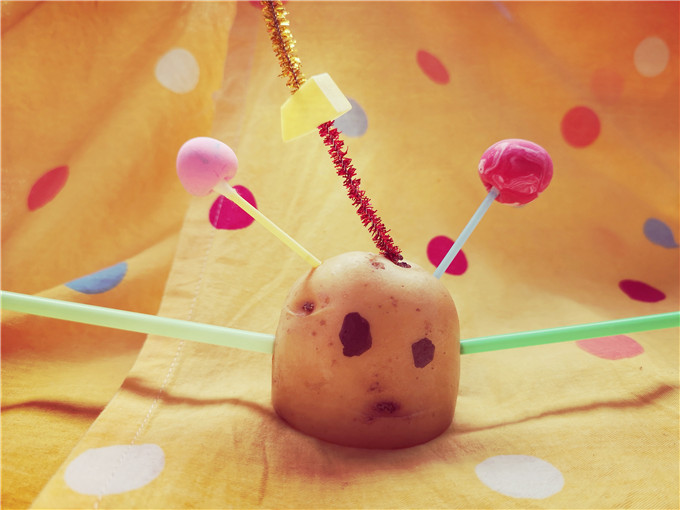 “我来介绍一下我的作品,这是用半个土豆和吸管做出的一只大青蛙。”