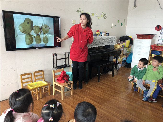 快看!“刺猬、小狗、河马……”。“浑身都是长长的刺,像针一样。”“这土豆小人好可爱啊。”“我发现这些作品都是土豆变出来的,真的好神奇!”“老师,我们也想来玩一玩土豆大变身!”