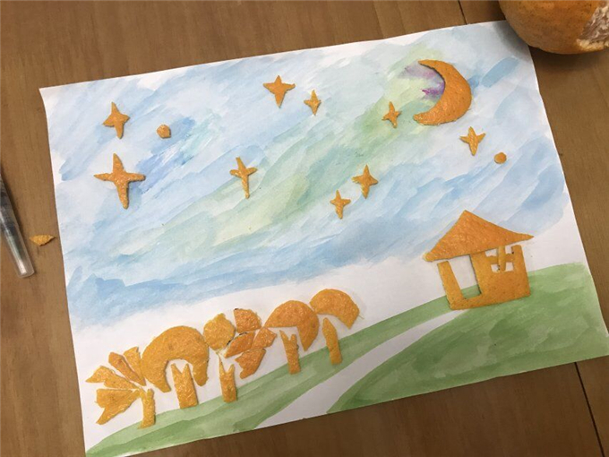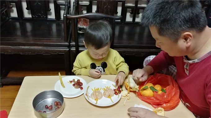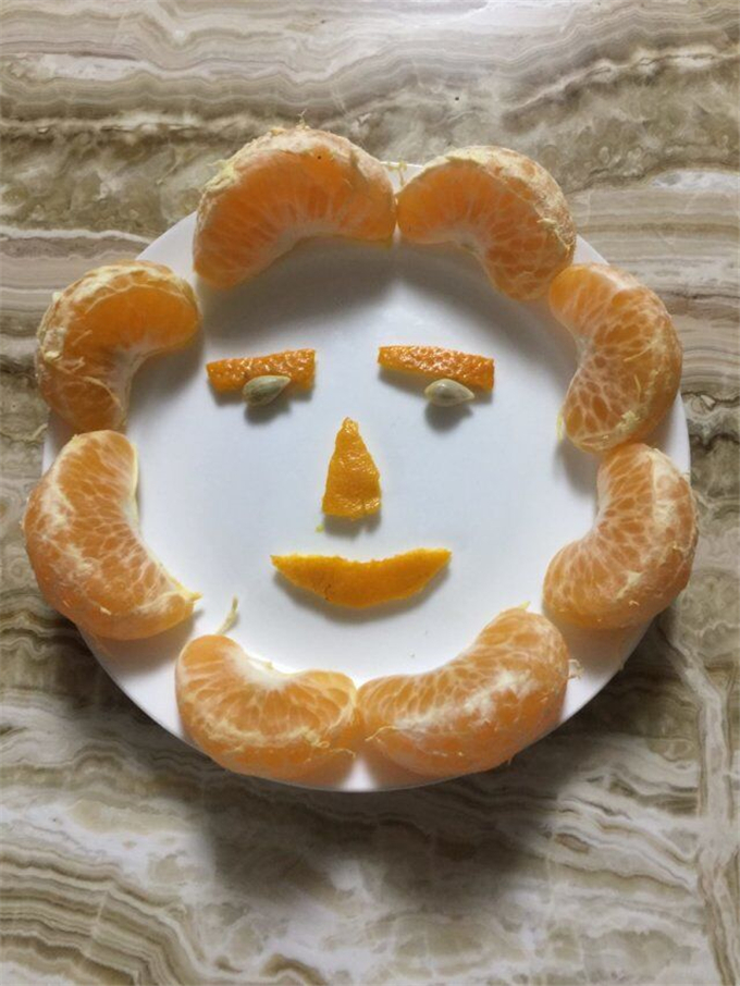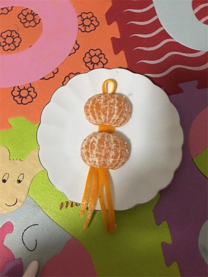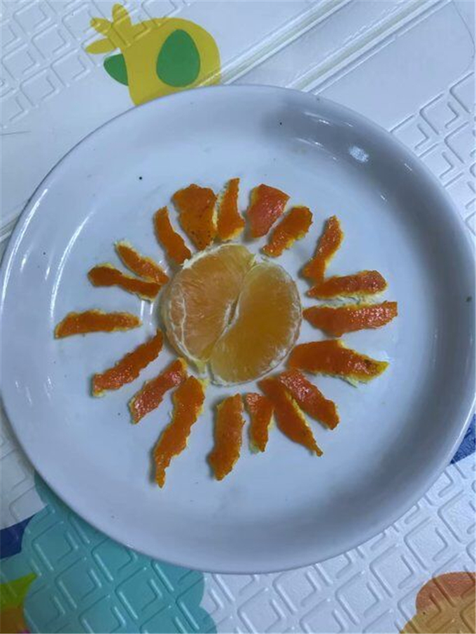 还有、还有,我们还跟爸爸妈妈一块做橘子拼盘呢!有的用橘子皮拼摆的;有的是用果肉拼摆的,有趣极啦!小飞机、小菊花、小脸庞、星光月夜、小灯笼、小太阳……到底哪个是你的最爱呢?你们也想玩吗?请快快加入我们哦!