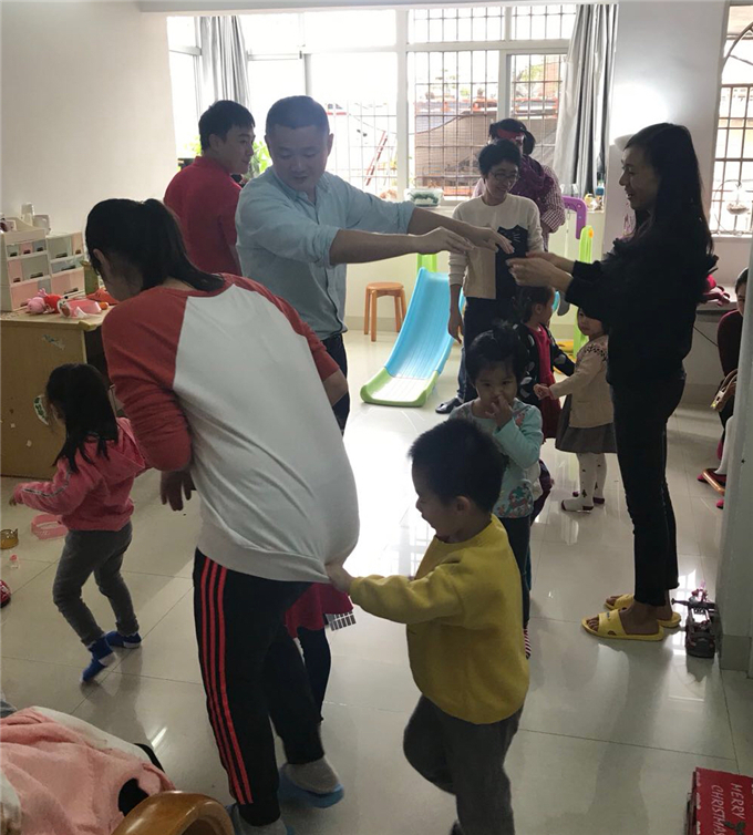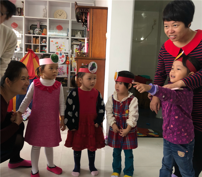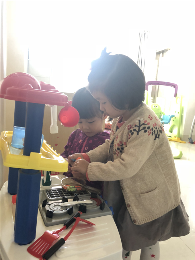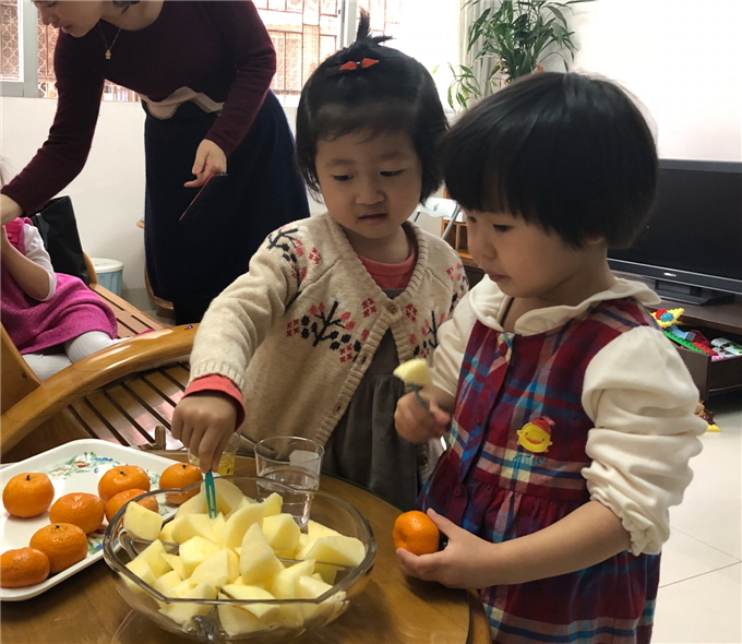 寒暄落座,用过茶点后,便是小朋友最喜欢的游戏环节啦。过家家、水果蹲、搭积木,小朋友三两组合,玩得不亦乐乎。