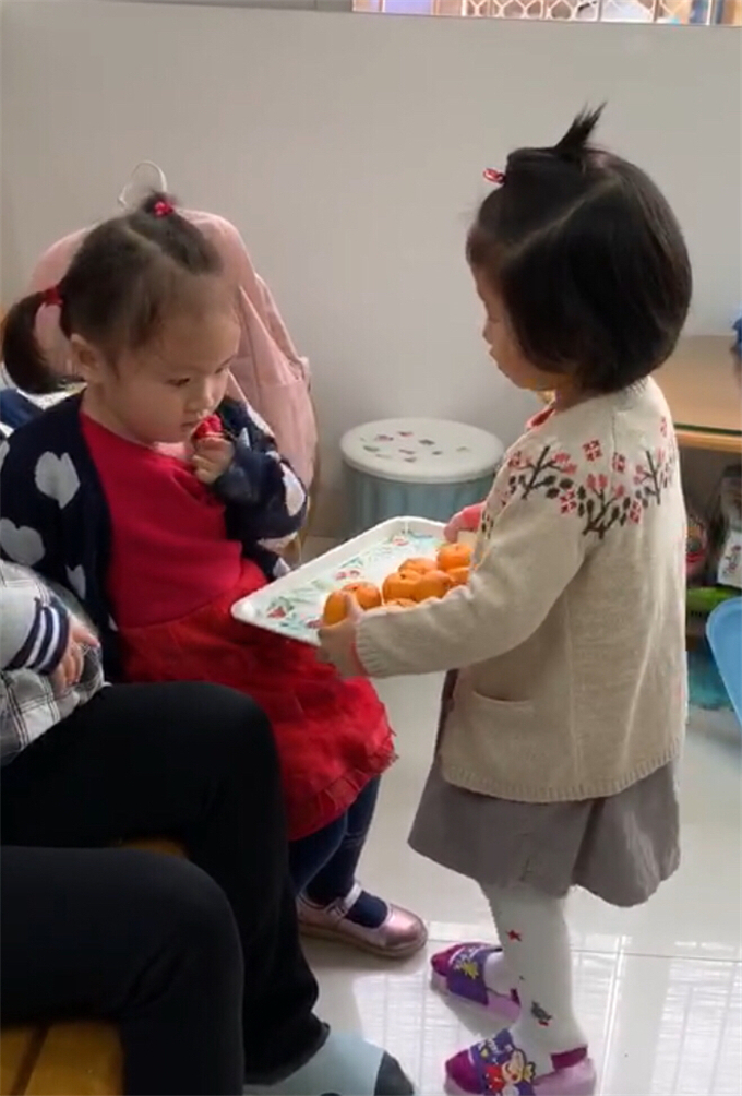 这可是第一次小朋友担当主角的串门活动哦。小朋友们都兴奋不已。“欢迎大家!”“请坐”“请喝茶”“请吃橘子”,苗苗小朋友热情地招呼着大家,忙得热火朝天,俨然一副小主人的模样。小客人们带来了各式各样可爱的小礼物,好贴心啊。“谢谢”“不客气”,小朋友们在幼儿园学会的礼貌用语和文明礼仪都排上了用场。虽然是第一次亲子入户活动,可无论是小主人还是小客人,都是彬彬有礼的社交小能手啊。