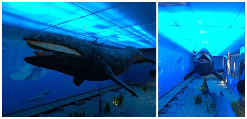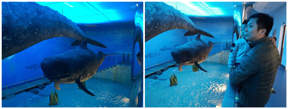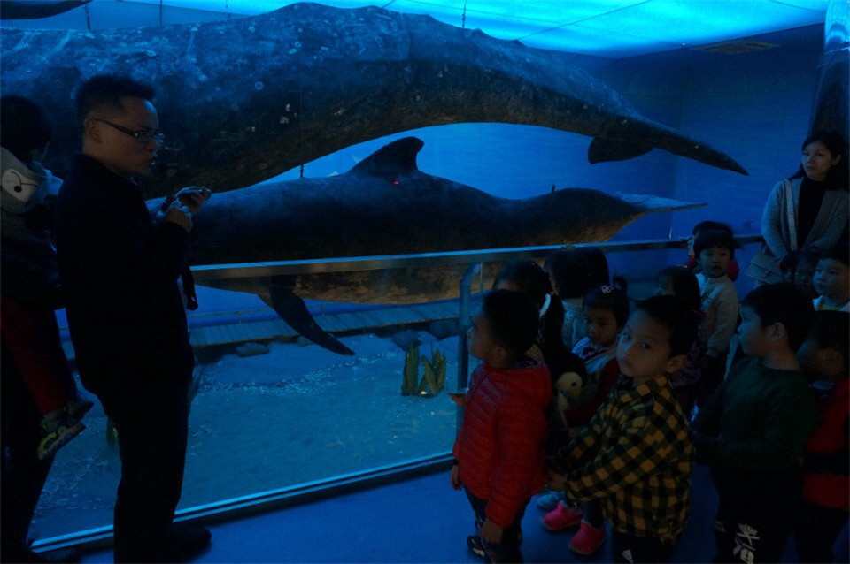 来听听小麦爸爸的介绍,“小朋友们,你们所说的‘大鱼’其实是鲸,这只最大的标本是头‘灰鲸’,这个标本的发现地就在咱们福建平潭,发现的时候已经死了,当时肚子里还怀有一只小灰鲸宝宝,非常的遗憾。”