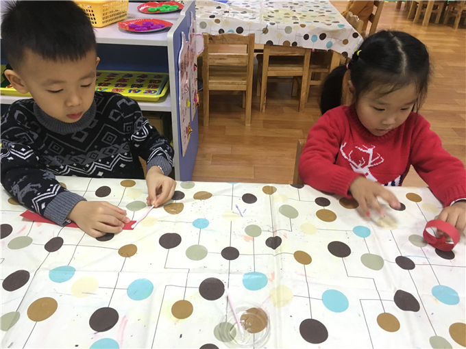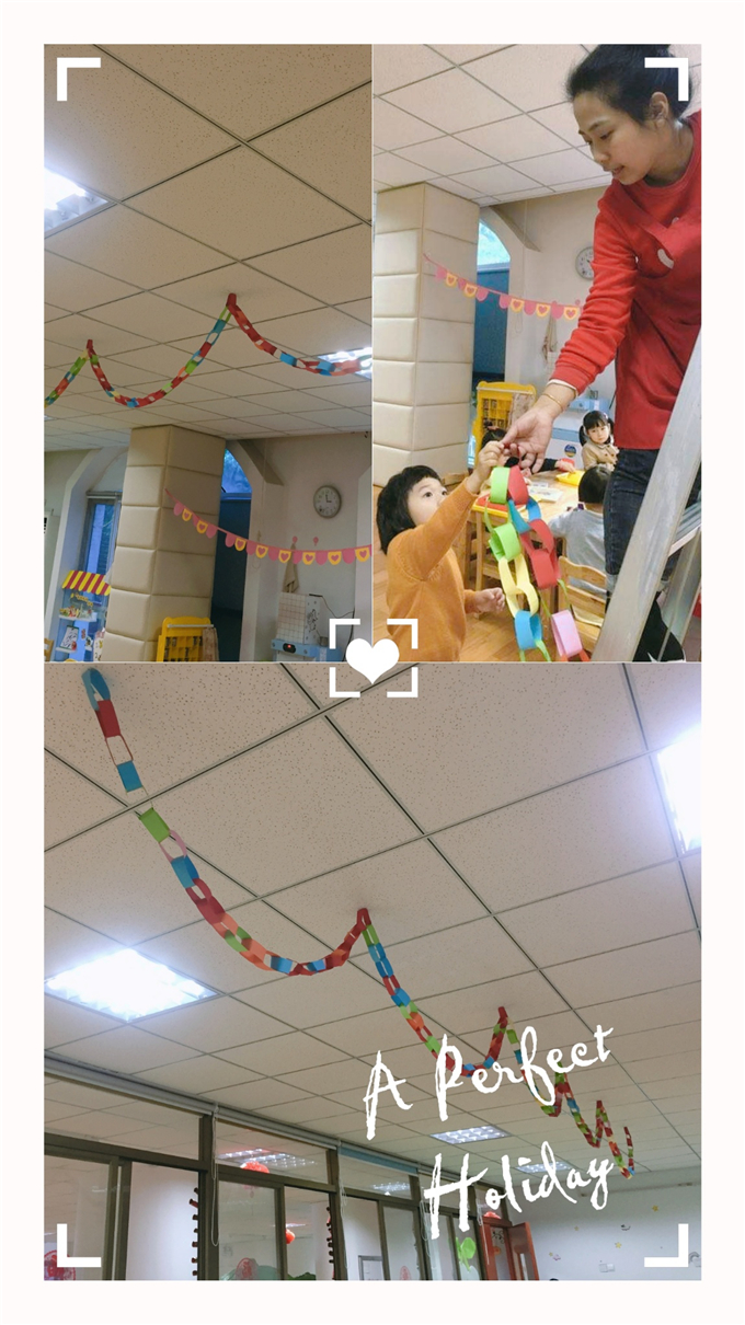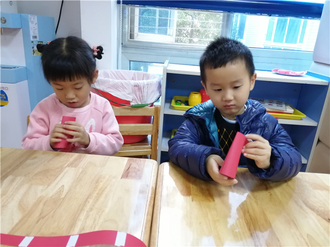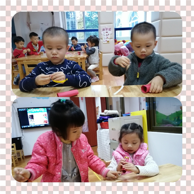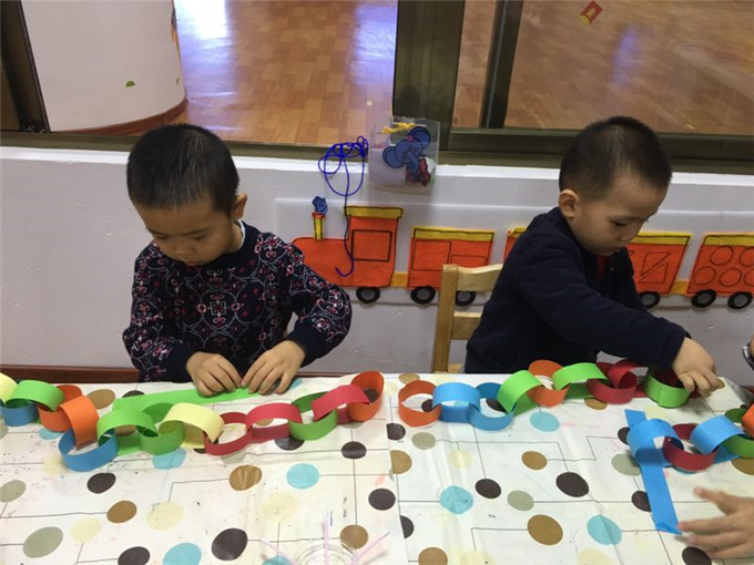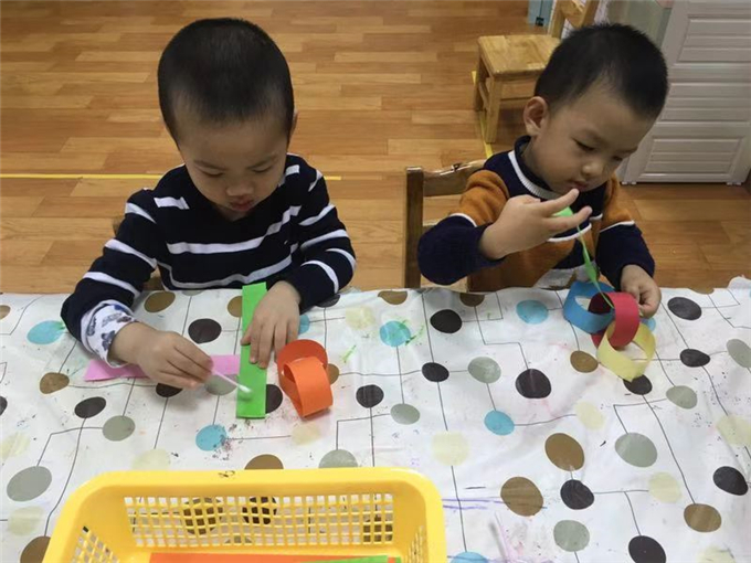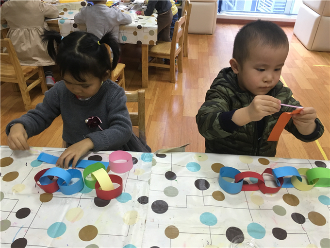 另一组的萌娃也不甘示弱,瞧!用一条条五颜六色的彩纸卷成一个一个圆环,一个扣一个。五彩拉花做好啦!