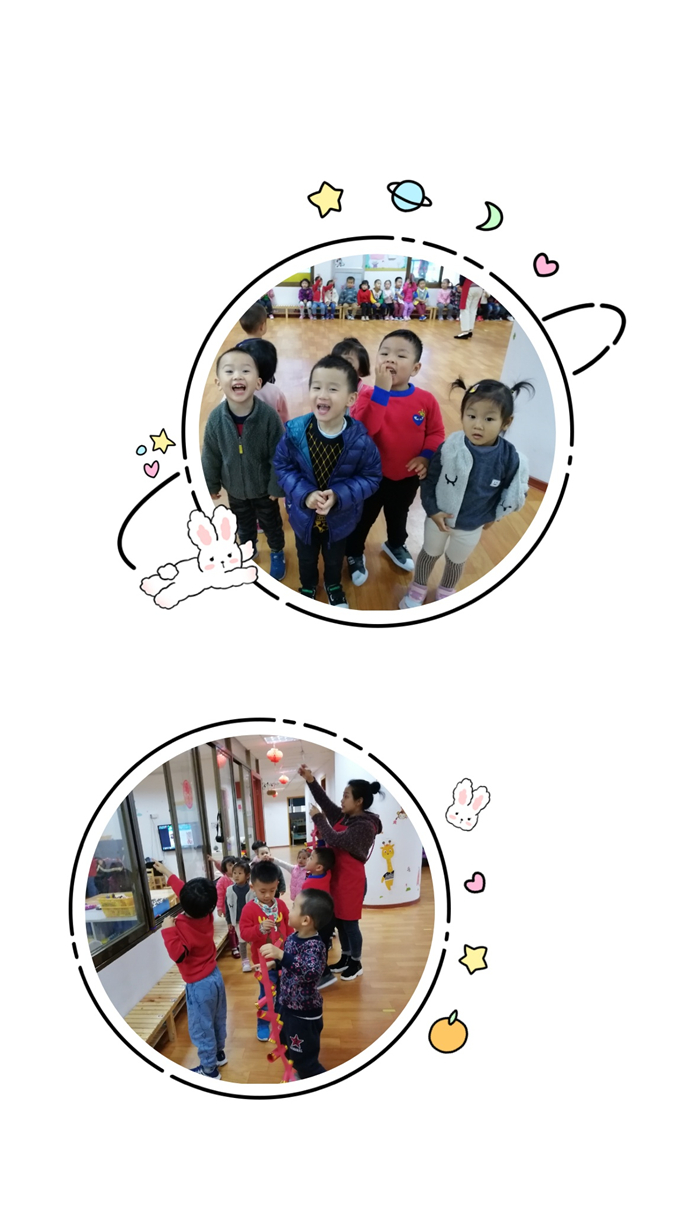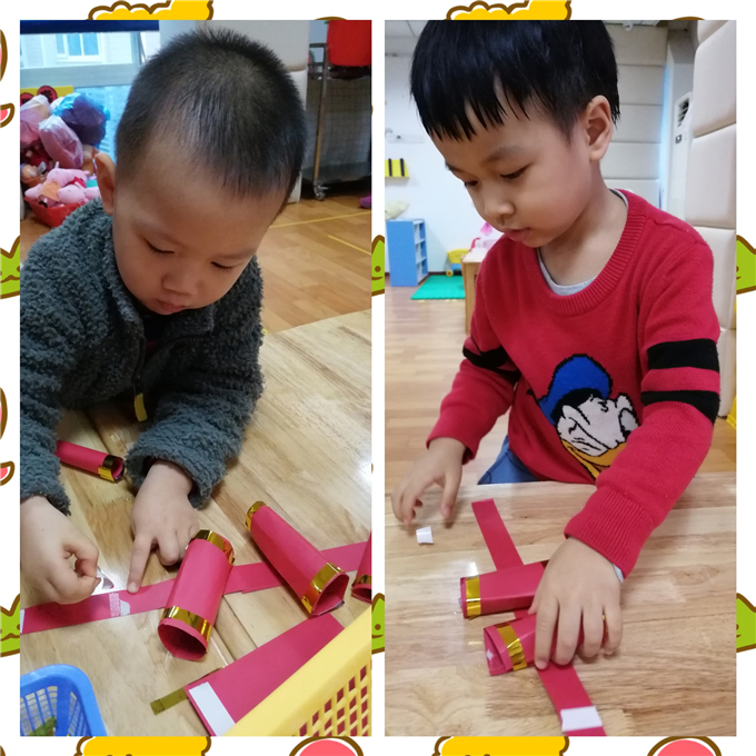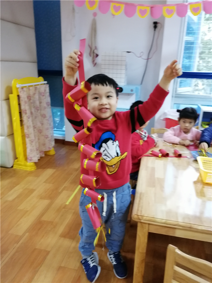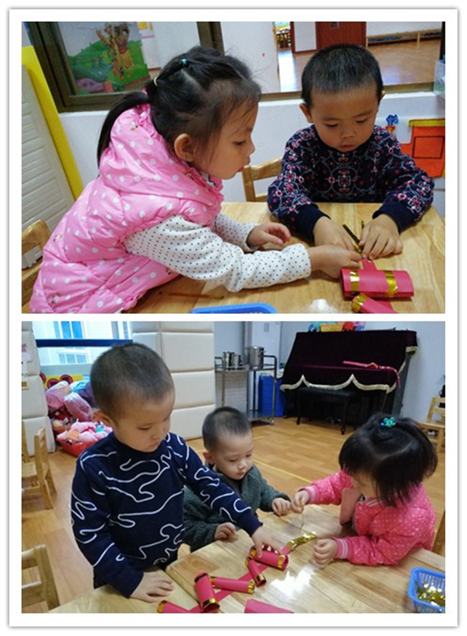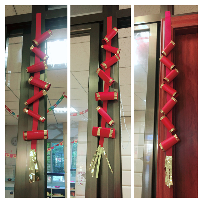 瞧!小八班的萌娃们还学会的相互合作。自己制作的鞭炮一串串挂在教室的窗户上,一下子教室被“打扮”的喜气洋洋。