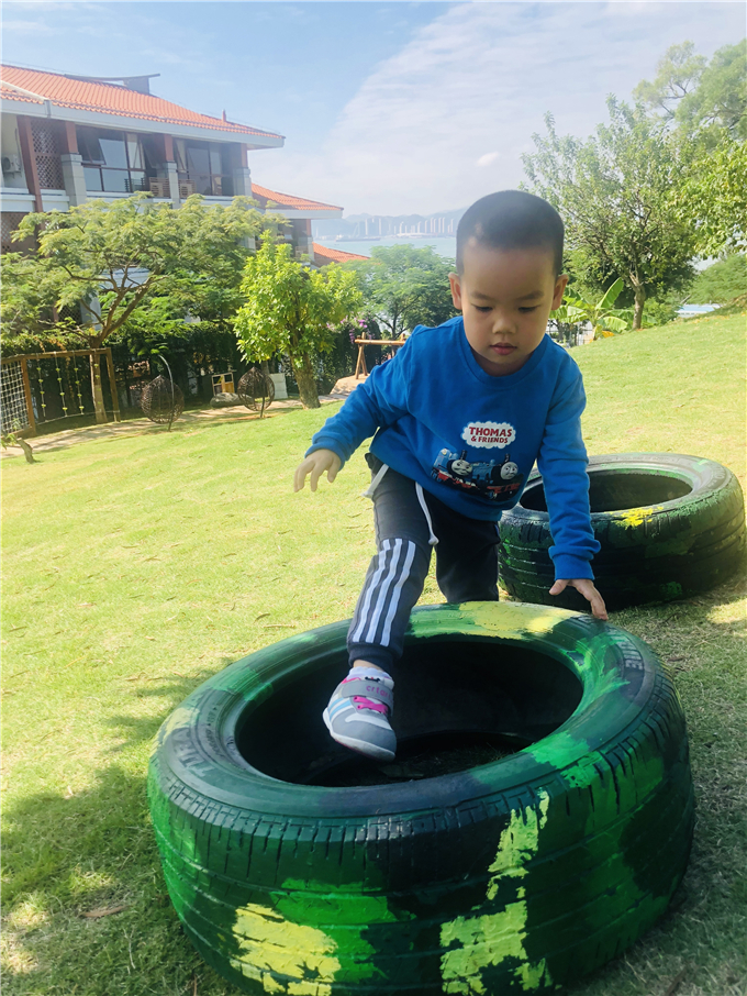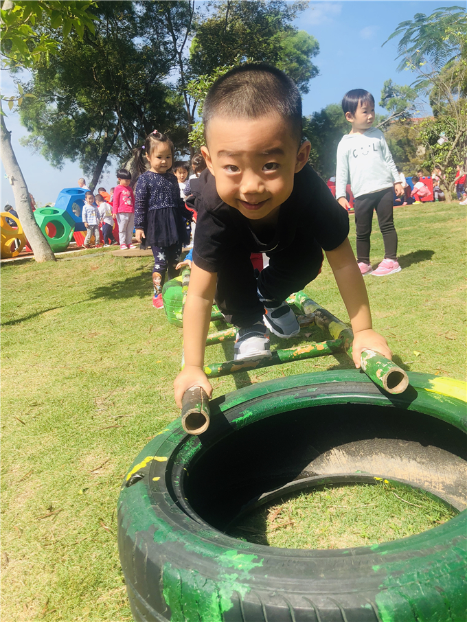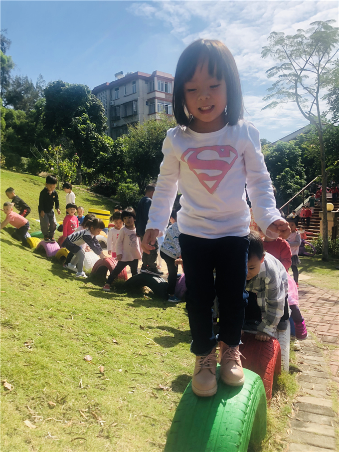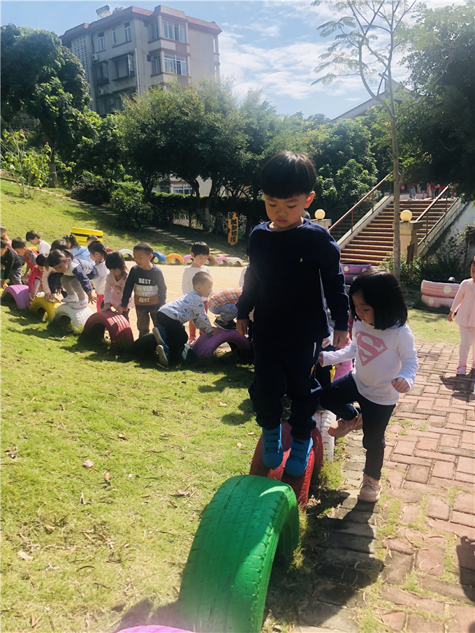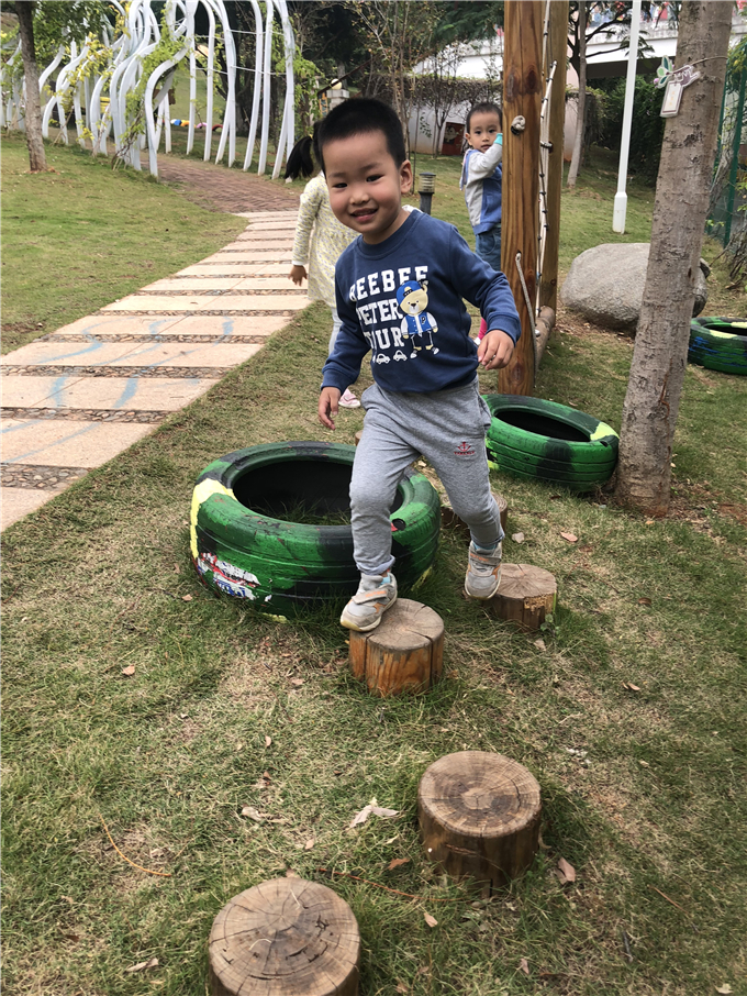 瞧,一到小山坡,一排彩色的轮胎形成一片美丽可爱的“彩虹”,“我们走在彩虹上耶!”小朋友们张开双臂,一步一步走着,越过一个又一个七彩轮胎,通向童真无极限的“世界”……