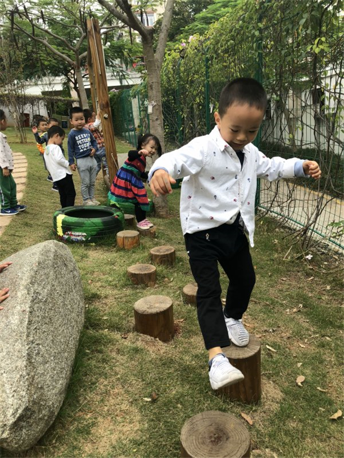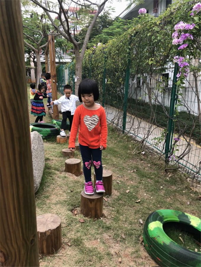 “咦,草坪对面是什么?”平平忽然被什么吸引过去,“快看,这里有小木桩!”和和听闻便提议:“我们来比赛看看谁过小河更快!”说着,小朋友们小心翼翼地踩稳木桩,把草地当作小河,要过河喽!