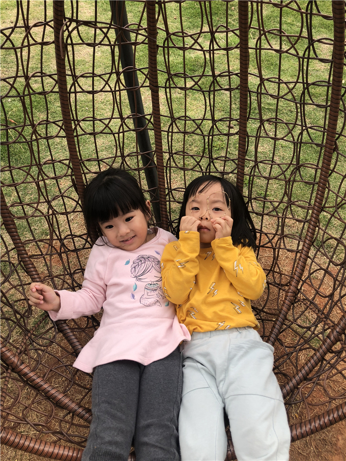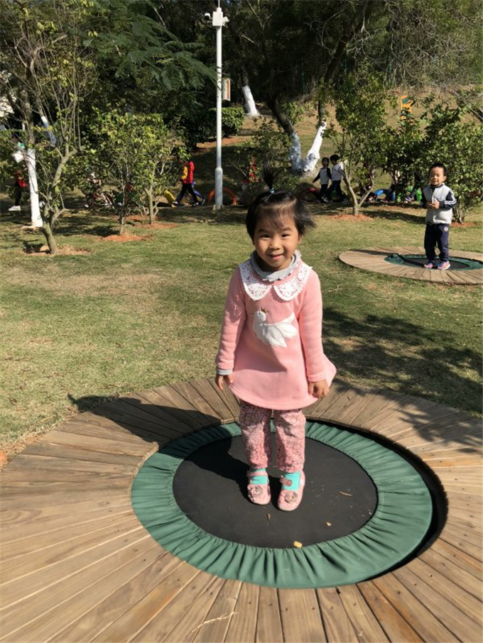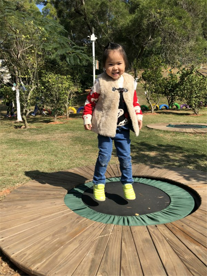“老师,你看我跳得高不高?”希希和芮芮一人一个蹦蹦床,“扑腾扑腾”的跳着,像两只活蹦乱跳的小兔子。