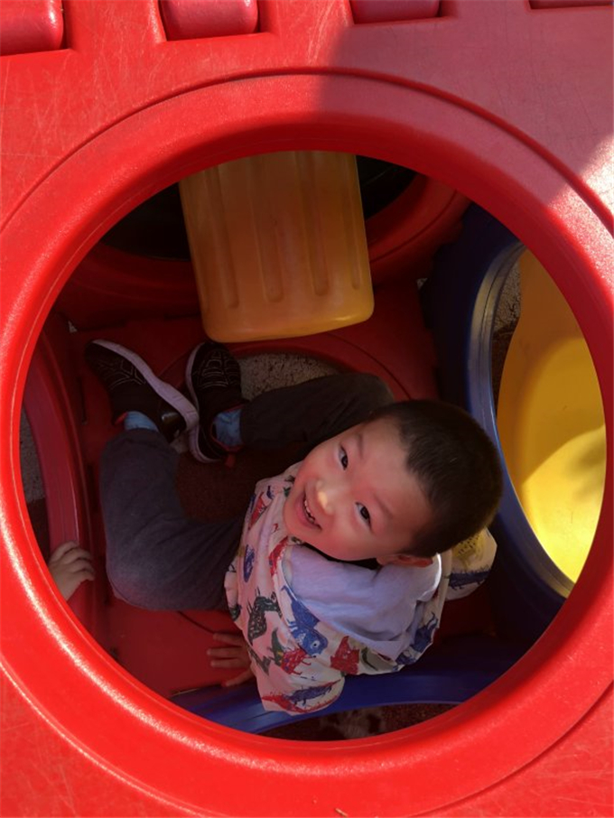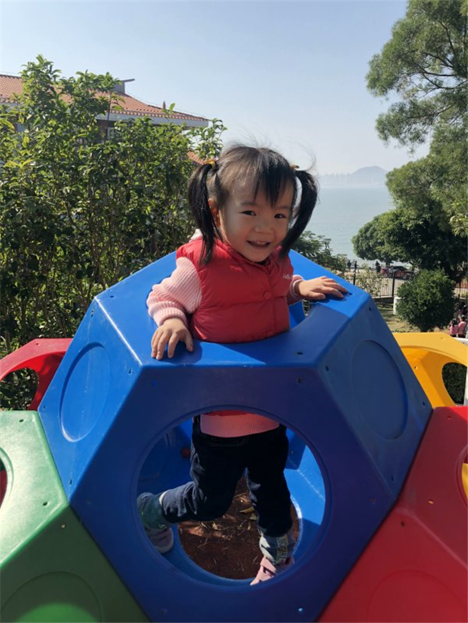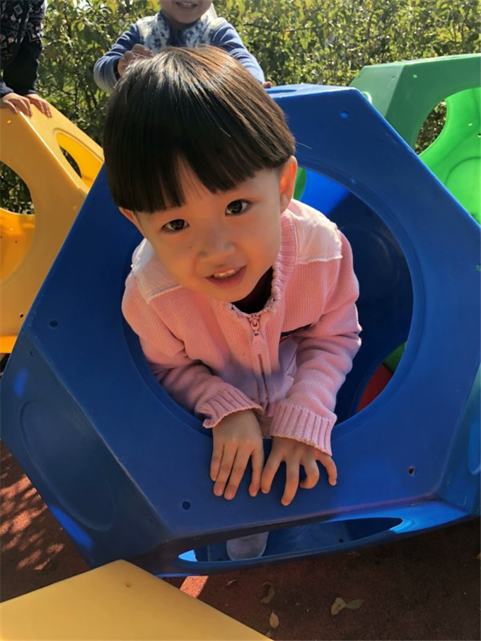 在迷宫边的塑胶地上,小朋友们又化身小蜗牛,躲在积塑搭好的小小“蜗居”里嬉戏,让人忍不住快速记录下这一张张天真浪漫的快乐脸庞。