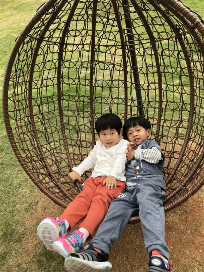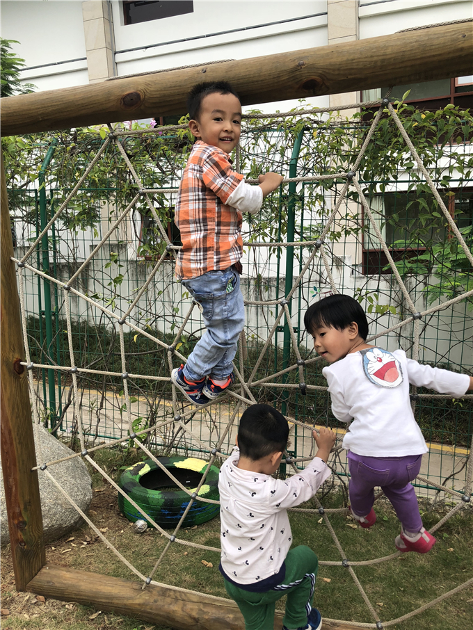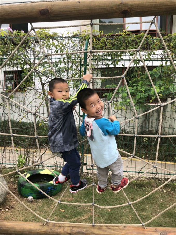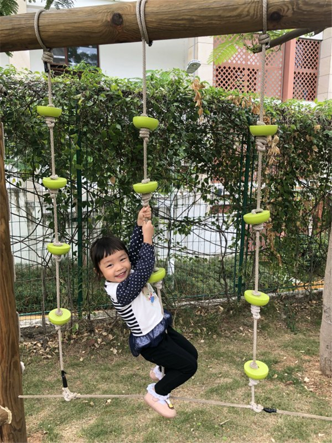 小与正勇敢勾在一根攀爬绳上,露出喜悦的笑脸。