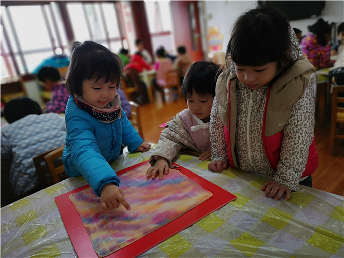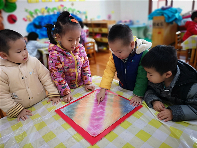 “哇~五颜六色的手帕,好美啊!”“有红色、黄色、蓝色......”听说小四班近日开了家“扎染坊”,咱们一块看看去?