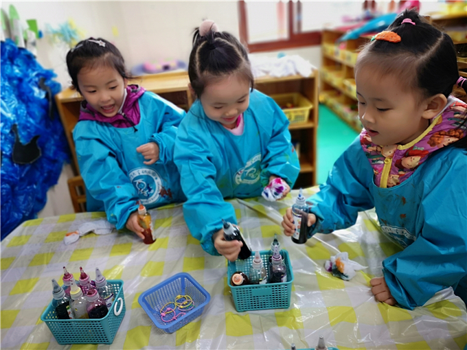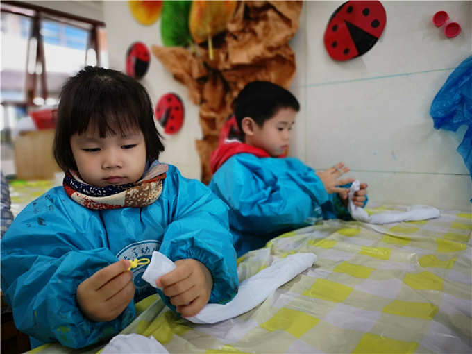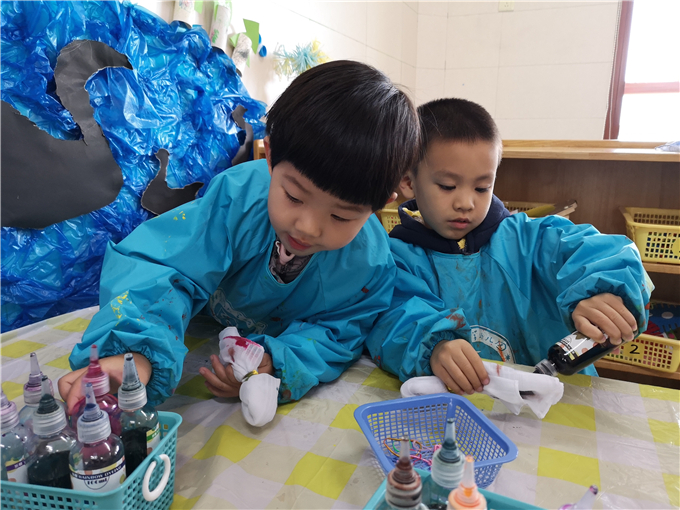 “先把布卷起来或折,再用橡皮筋把布团扎起来,越紧越好。”宝贝们根据老师的提示兴致勃勃的开始了扎染。有的将布团卷起来用颜料笔小心翼翼的在布上滴上颜色,还有的用皮筋将布扎成“小辫子”开启了创作模式,孩子们玩的不亦乐乎!