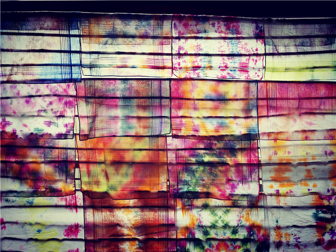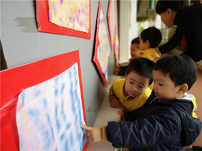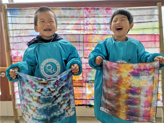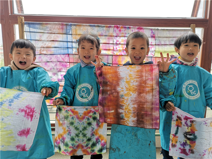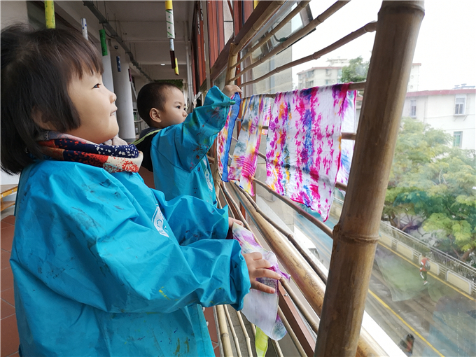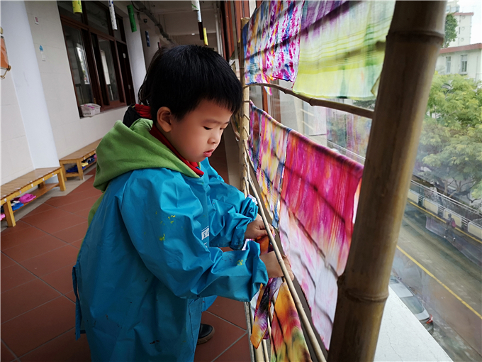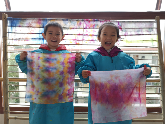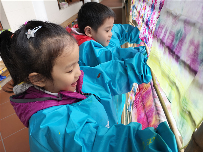 宝贝们将扎染好的布悬挂在竹架上,他们彼此驻足欣赏,乐此不疲。“哇,我的布染的好漂亮啊!”“我染的颜色混在一起了,好神奇啊!”