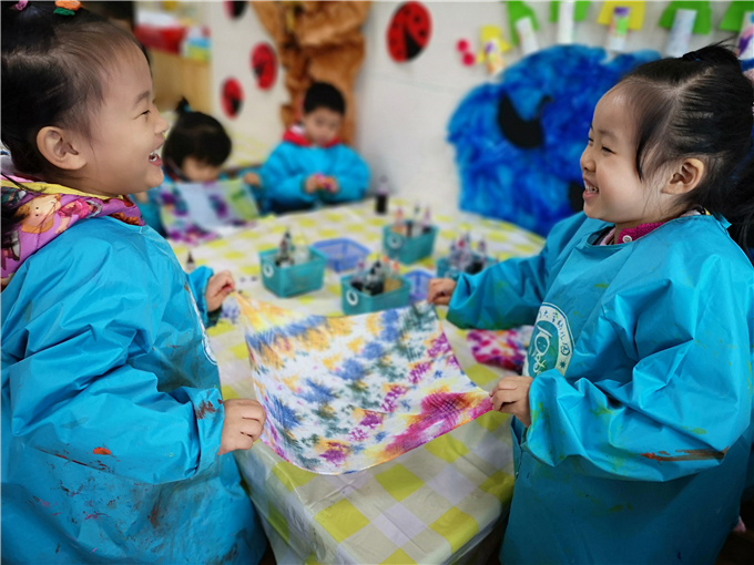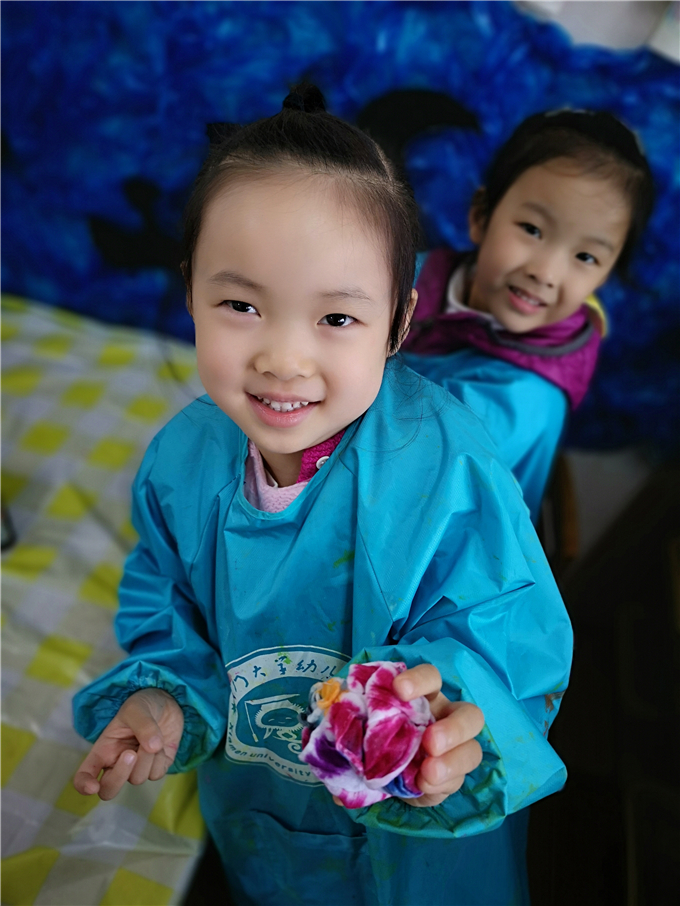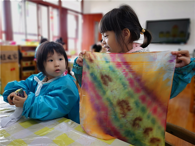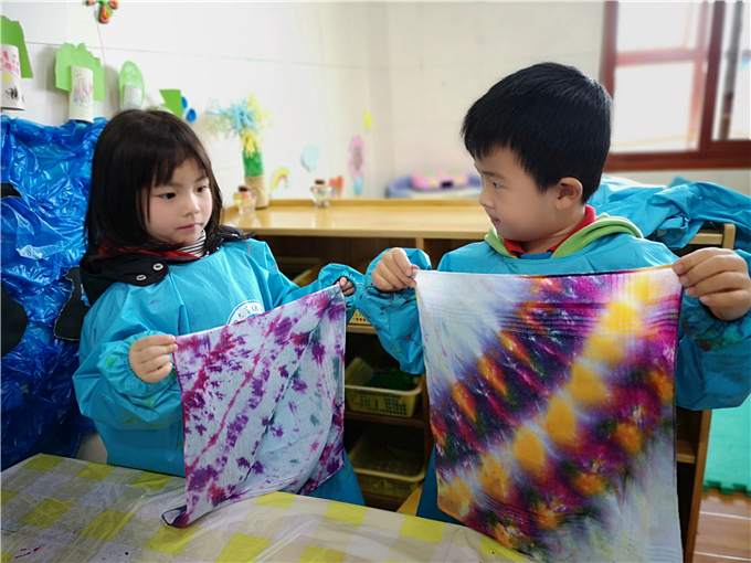 小小的一块布,在宝贝们奇思妙想的创意和神奇的双手下,即刻变出美妙神奇的图案!每一件扎染作品,都有着自己独一无二的美。扎染活动的开展,不仅培养了孩子们对于中国传统艺术的兴趣,也让扎染这道凝重素雅、韵味别致的艺术大餐得到了传承。