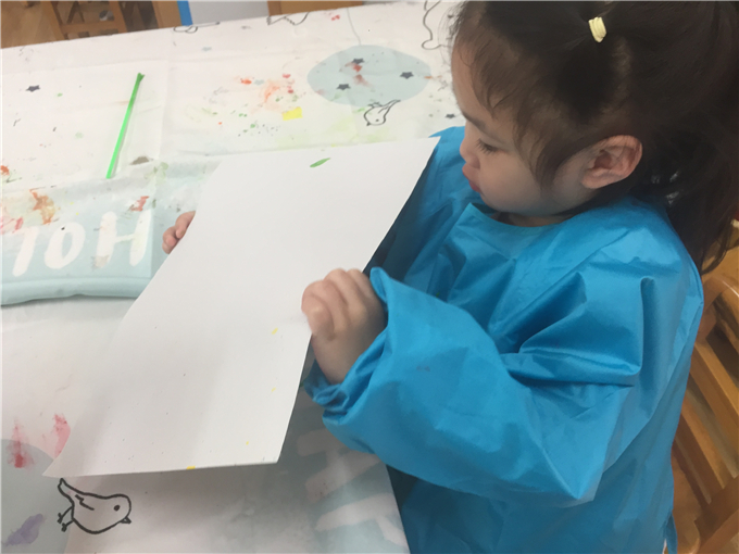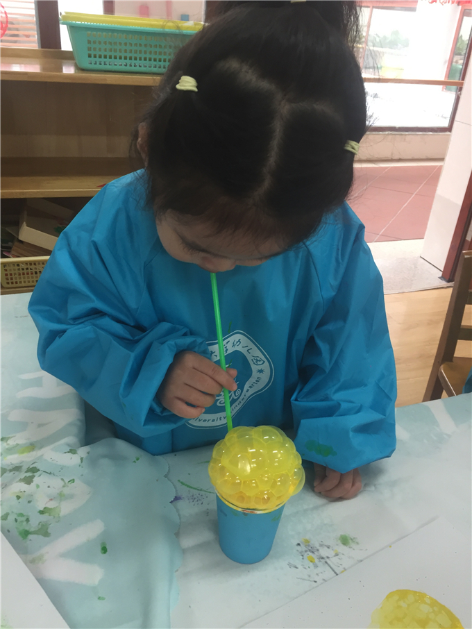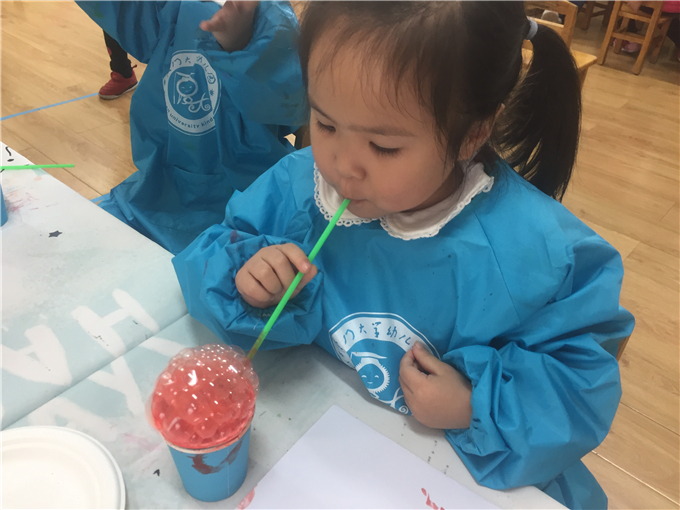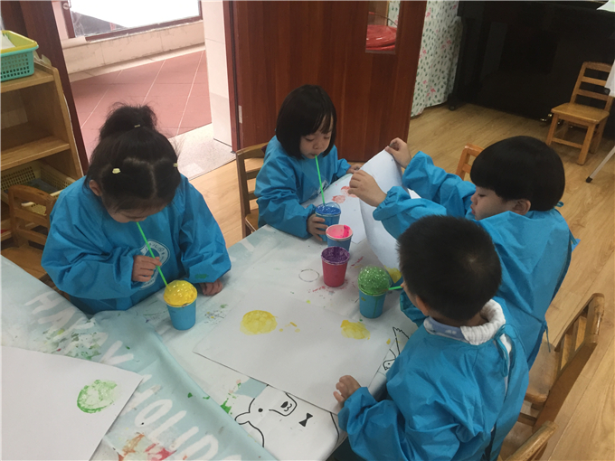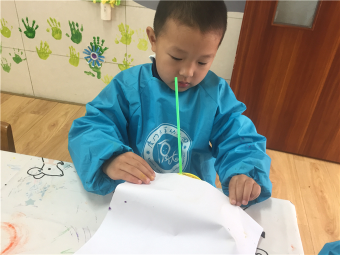 “一把小吸管,亲亲泡泡水,嘴巴轻轻吹,纸上跳个舞”简单的儿歌让孩子们对泡泡画的创作提出了要求,瞧,孩子们看得可仔细了!