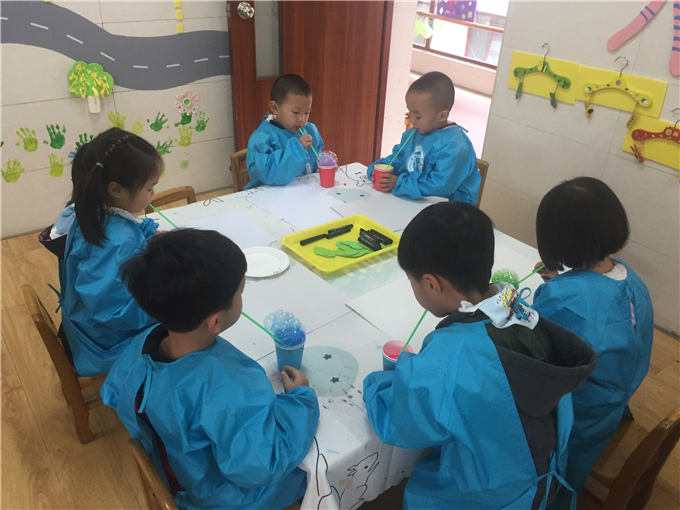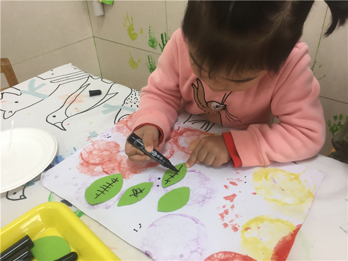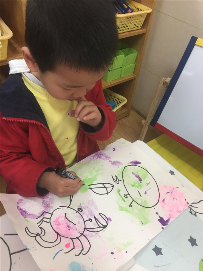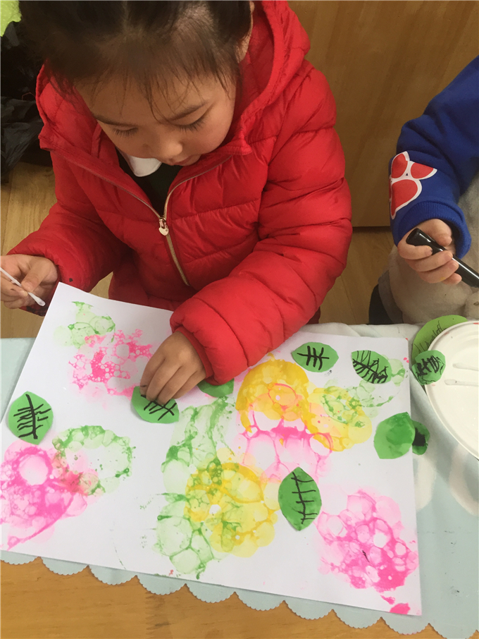 孩子们又在泡泡画的上粘贴了树叶。看,小小的吸管,简单的泡泡水变换出了美丽的花园世界。有的宝贝还添画了小螃蟹、小鱼……变成了有趣的海底世界。