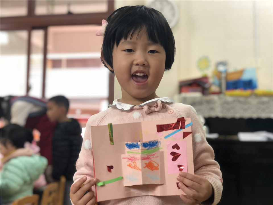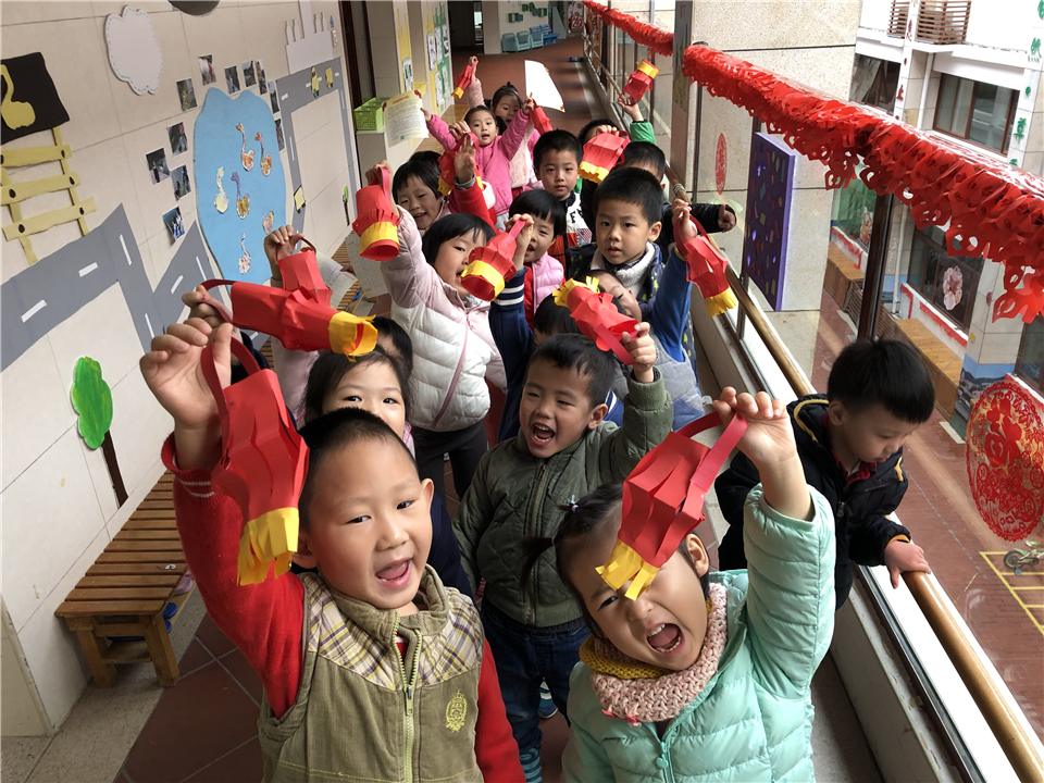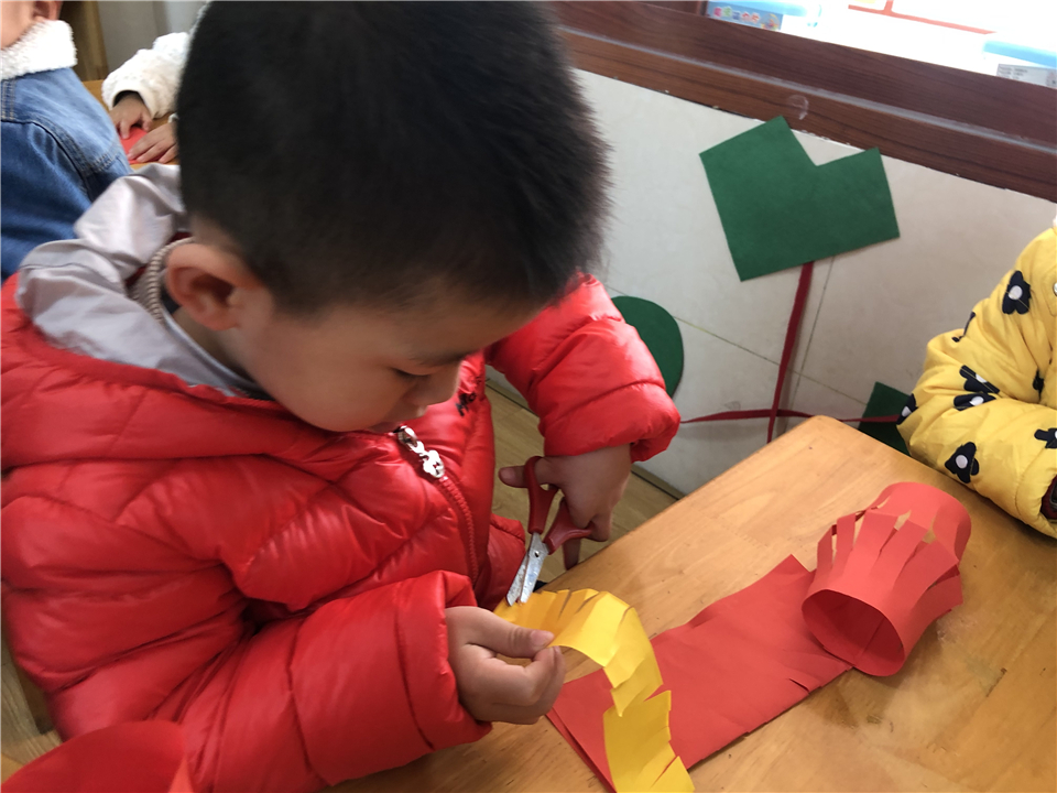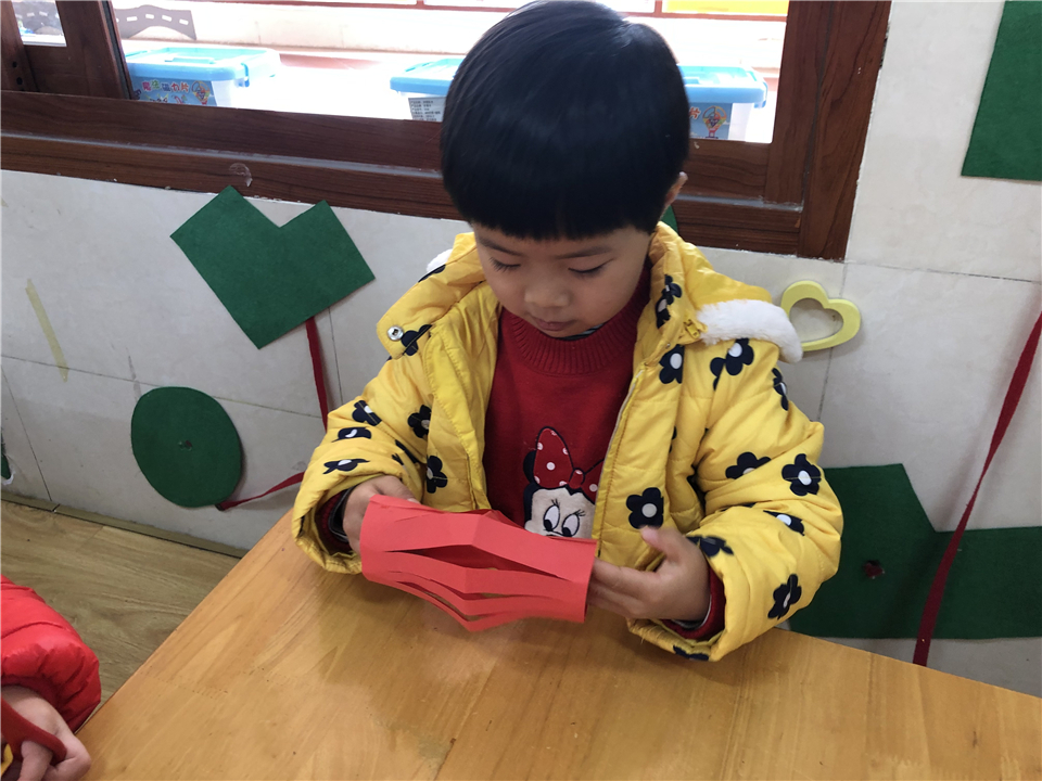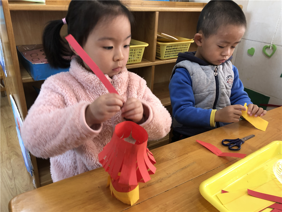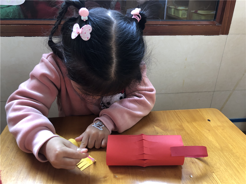 “剪出灯笼的小尾巴、贴上灯笼的小把手,大功告成!”