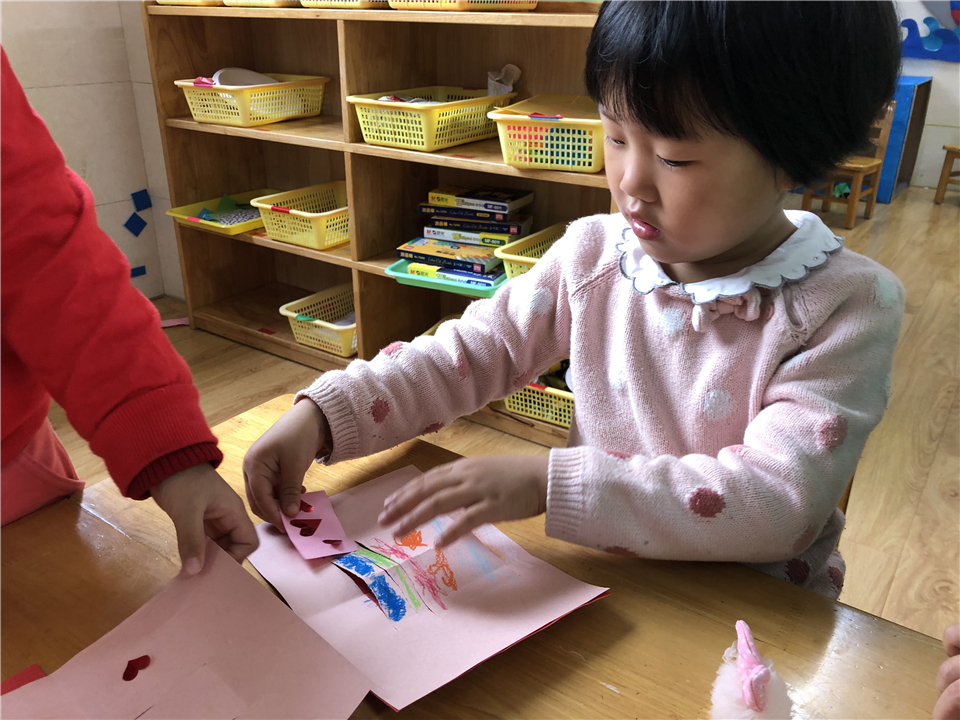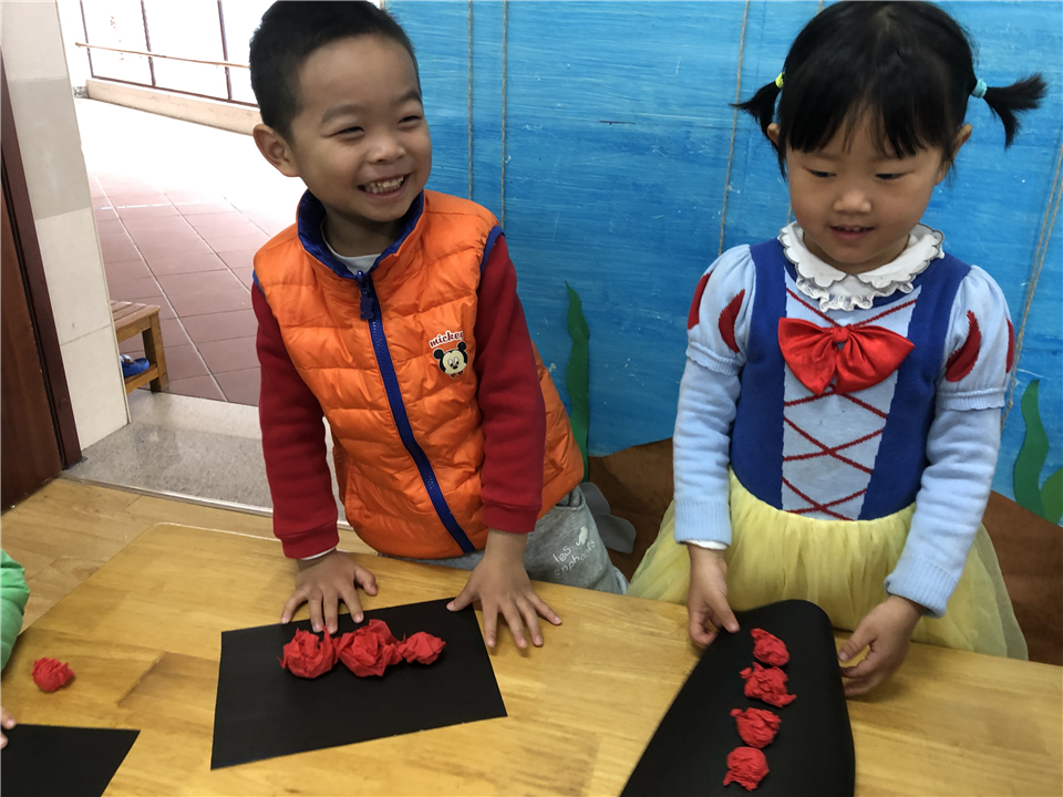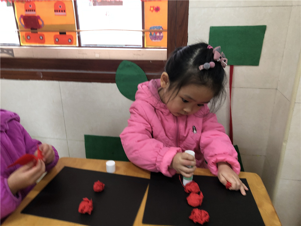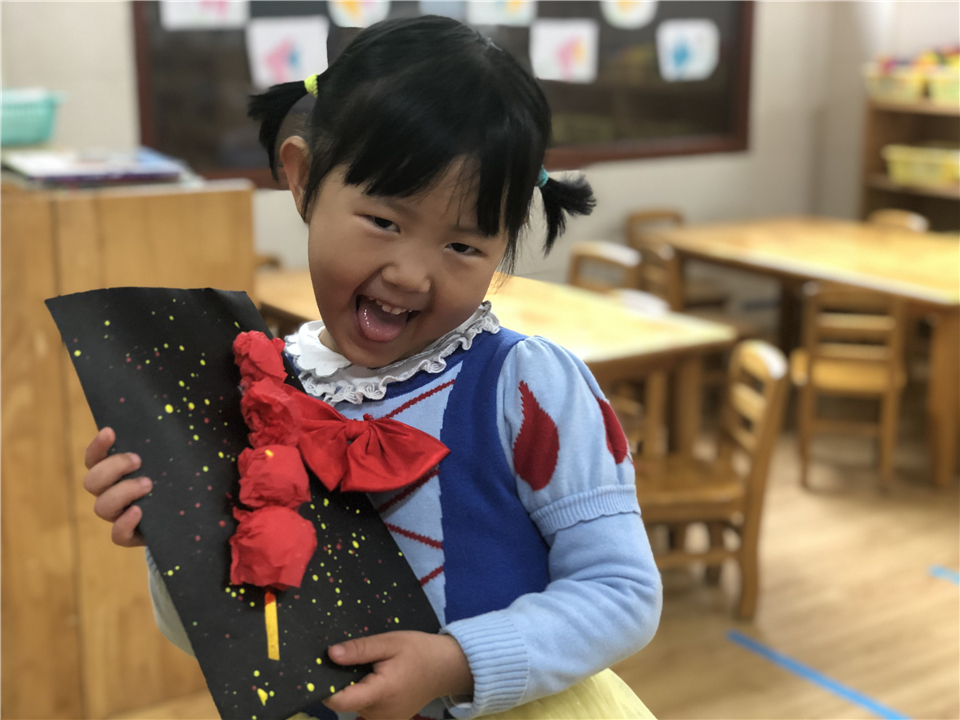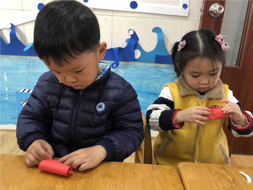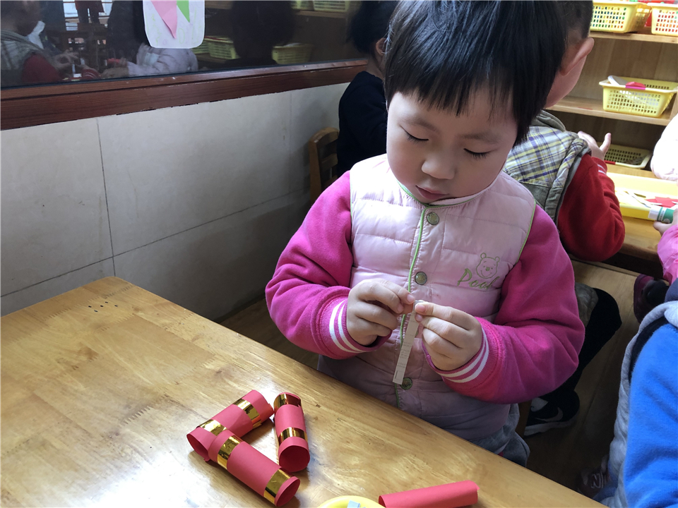 “把纸张卷一卷,涂上胶水贴一贴,耶!我的鞭炮做好啦!”