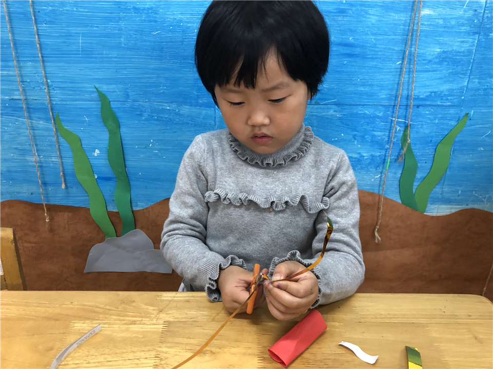 “头和尾卷起来粘一下,嘿嘿,灯笼的身子完成啦。”
