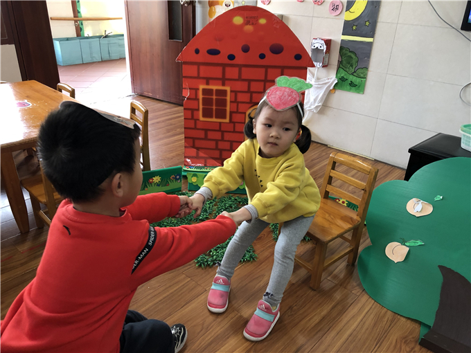 你瞧,扮演萝卜的贝贝在表演时还尝试给游戏增加了一段情节。只见贝贝酷酷地站起来对着要来拔萝卜的“爷爷”、“奶奶”“小姑娘”们说,“嘿,我是一颗超大、超重的萝卜,想要把我拔起来带回家,可没那么容易哦!” 那手势、那阵势显得格外地贴切、可爱。