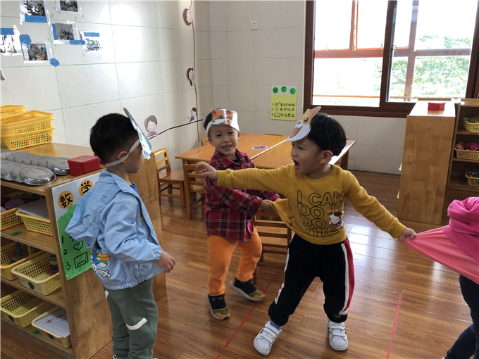 一段时间以来,宝贝们在老师循序渐进的鼓励与帮助下,部分原本不大愿意和同伴一起游戏的宝贝有了些许变化。在游戏氛围的感染下,宝贝们开始渐渐地参与游戏,挑选自己喜欢扮演的角色进行表演。游戏中,宝贝们似乎更懂得团结的力量,知道了当遇到困难时,要像故事中的角色一样,互相帮助,齐心协力,才能取得最后的成功。