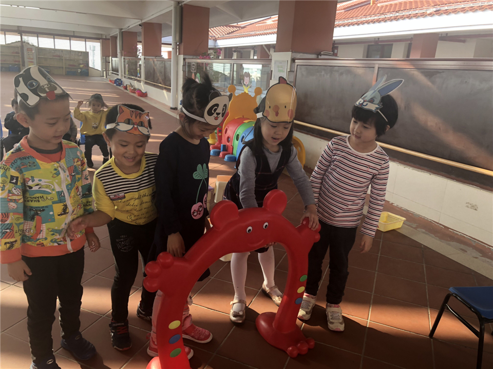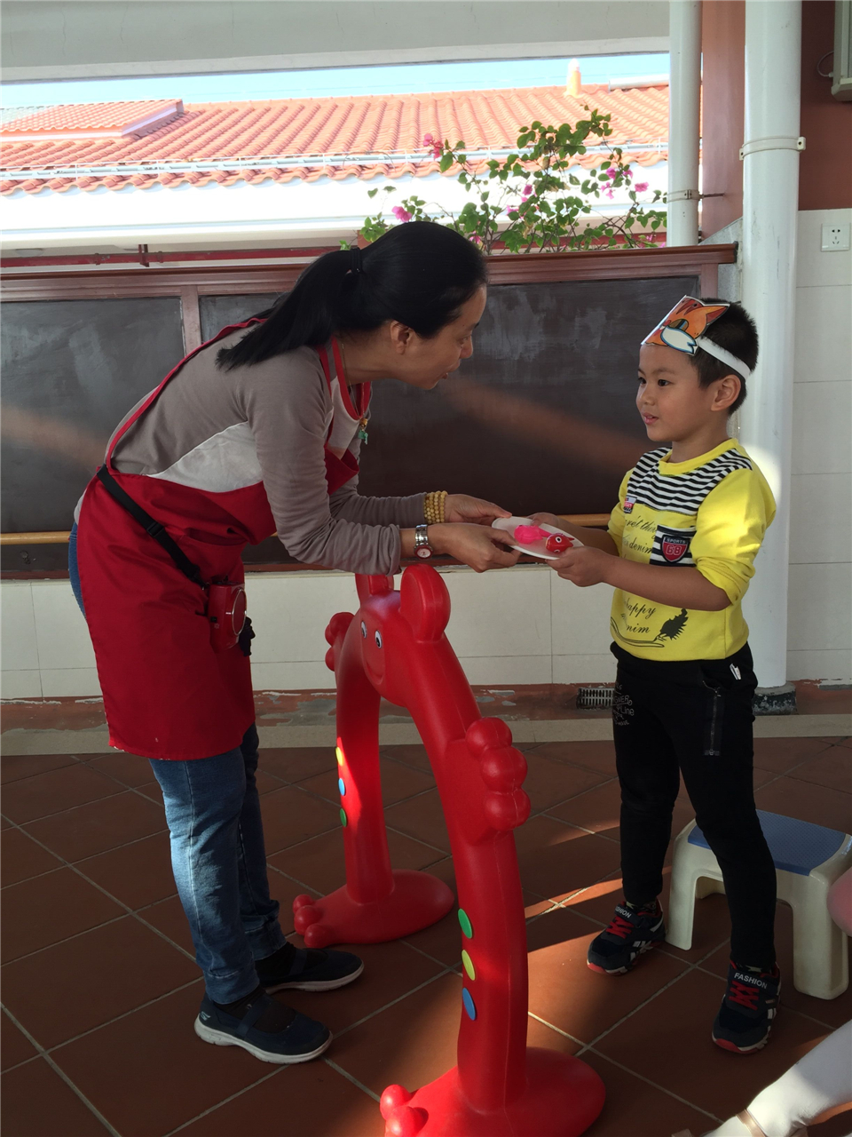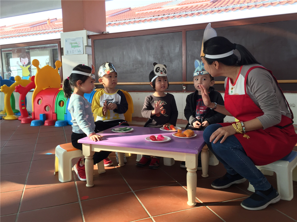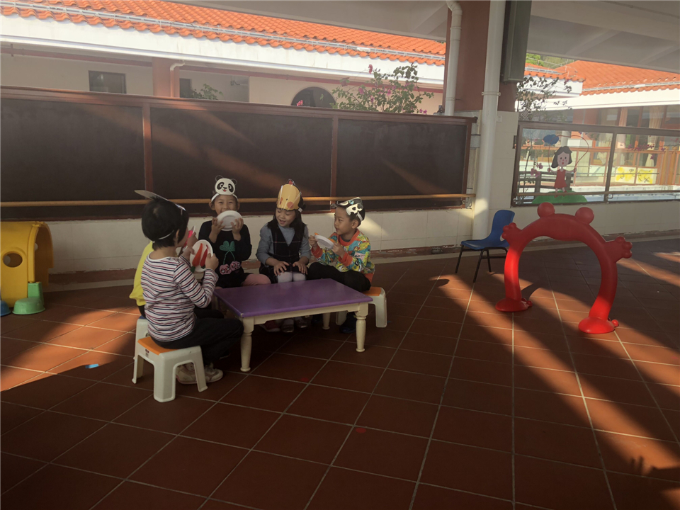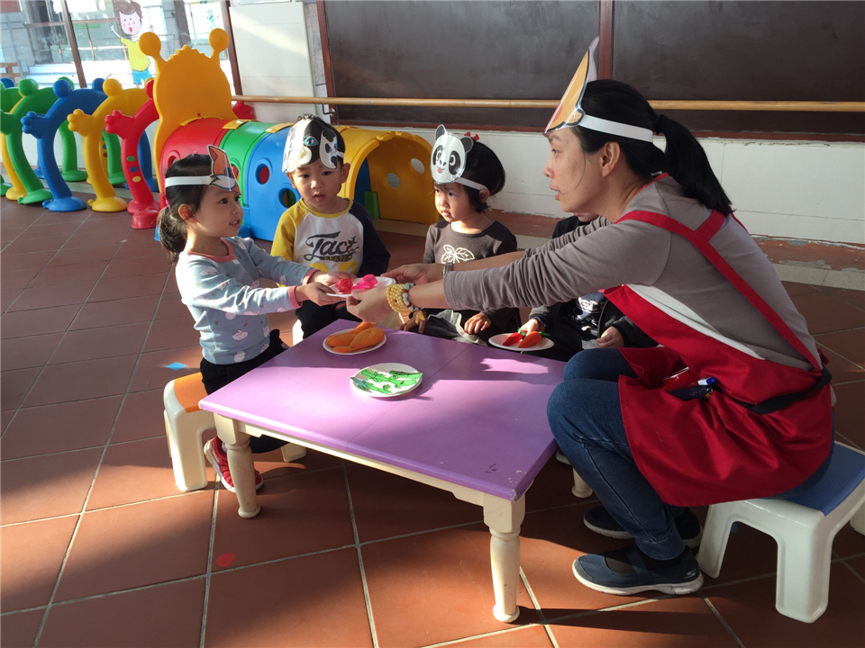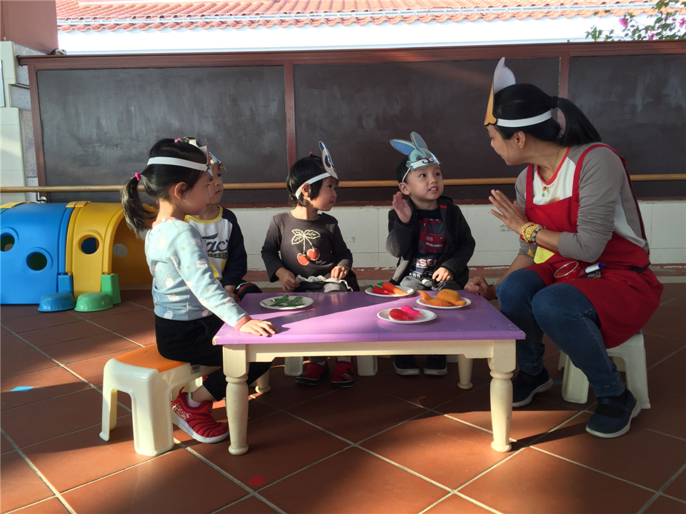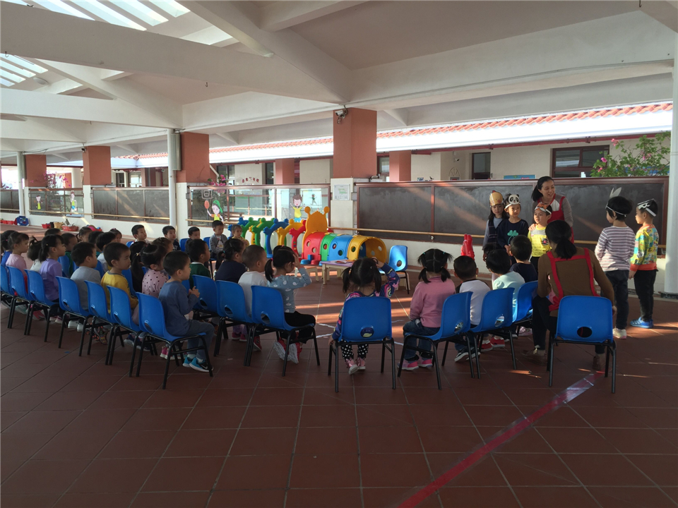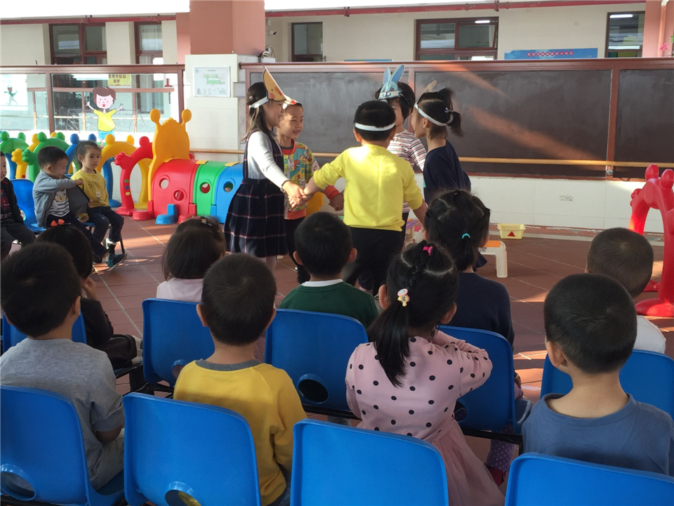 看着哥哥姐姐们精彩的表演,小六班的孩子们不知不觉地融入到游戏的情境中。在哥哥姐姐们的带动下,他们跃跃欲试地加入其中,紧接着展开了情境中的礼仪小游戏:“请吃胡萝卜”“请吃小鱼”…“谢谢”“不客气”、“再见!”你来我往,文明有礼貌。