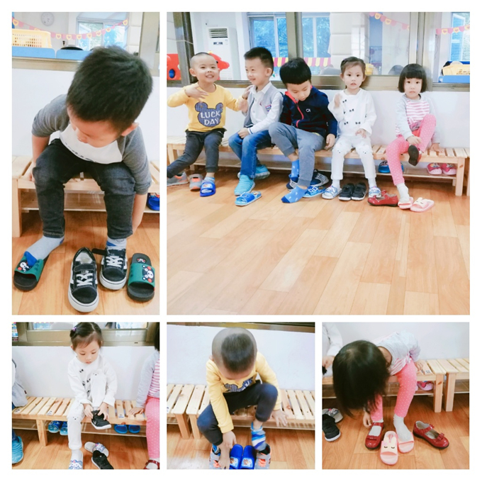 爸爸妈妈你们看,我已经会换鞋子、摆整齐,折好衣服更是难不倒我们。