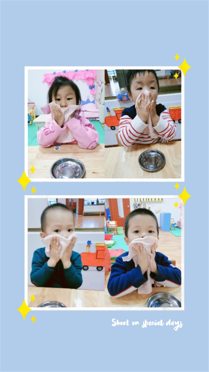 我还能一手拿勺子,一手扶住碗,安静地进餐。不挑食,不剩饭菜,不弄脏桌面、地面和衣服。还学会了饭后漱口、擦嘴巴哦!
