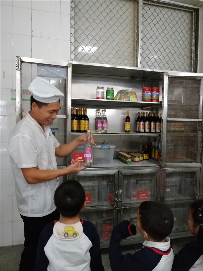“这里面装着什么呀?”一旁的调味柜引起了宝贝们的注意。原来这是厨房里放调味品的柜子,里面有酱油、醋、白酒、番茄酱、辣椒酱、八角、香菇等调味品,真是个百宝箱呀!