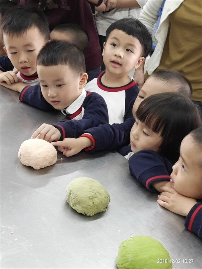 原来这些五颜六色的是菠菜汁、苋菜汁、胡萝卜汁,“魔术”时间开始咯。宝贝们目不转睛的看着厨师叔叔把白白的面粉变成五颜六色的面团。