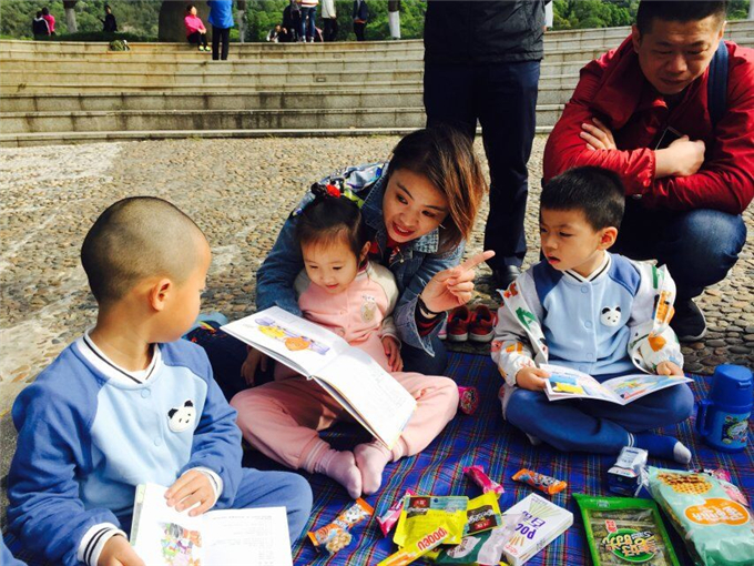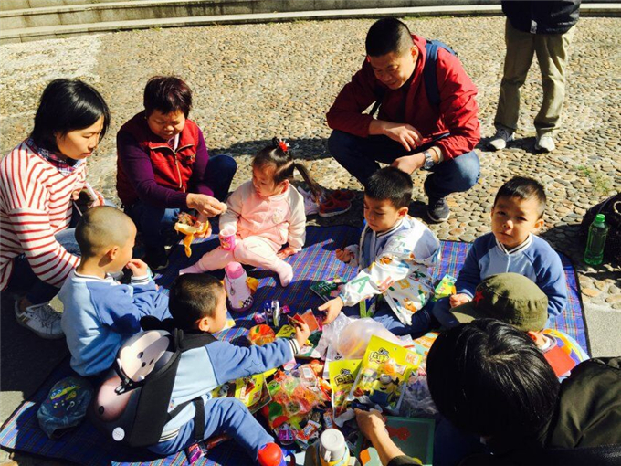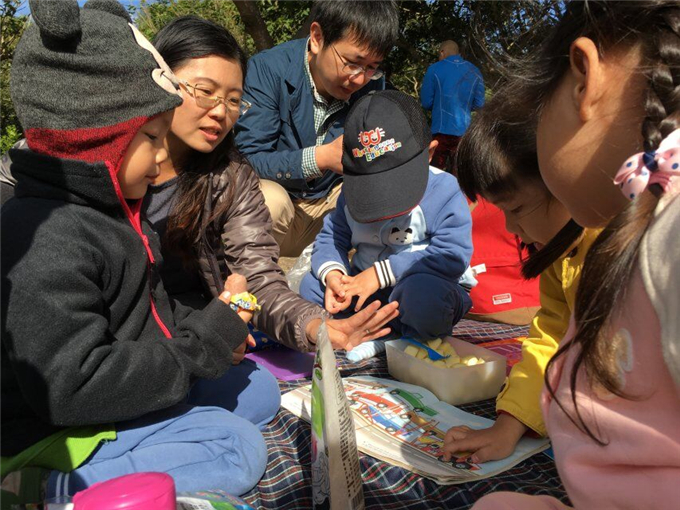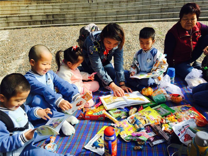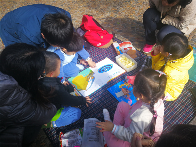 我们的亲子阅读有六个小组,每个小组三五成群,大伙儿摊开野餐垫,拿出准备好的各种各样的经典绘本和美食(零食)棒棒糖,小饼干,水果,蛋糕……琳琅满目的零食惹得宝贝们更加积极、主动地参与活动。