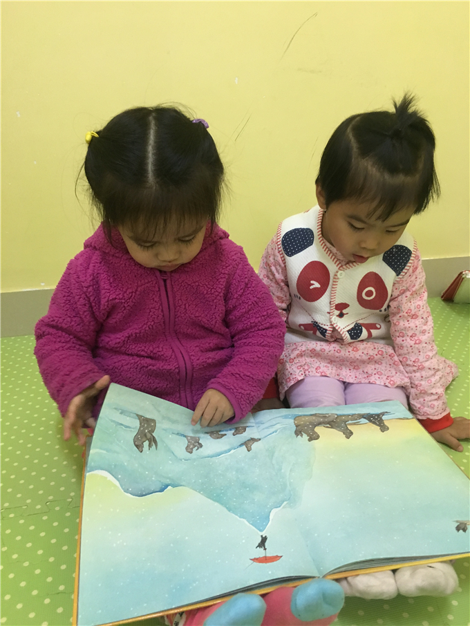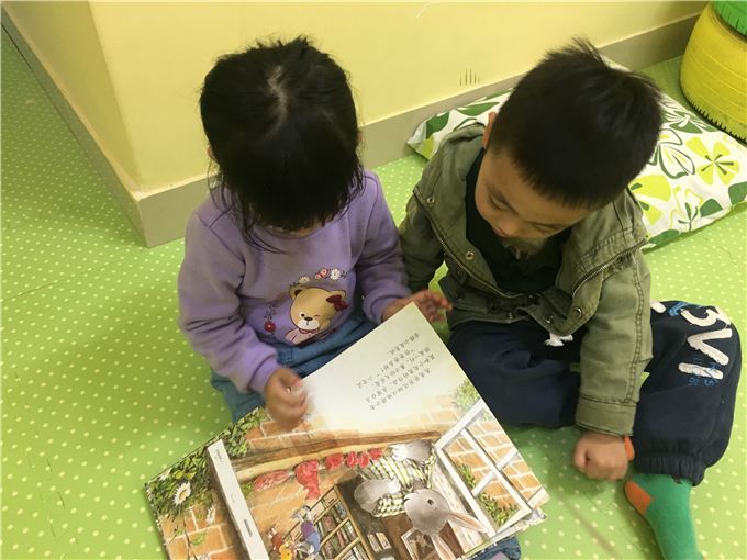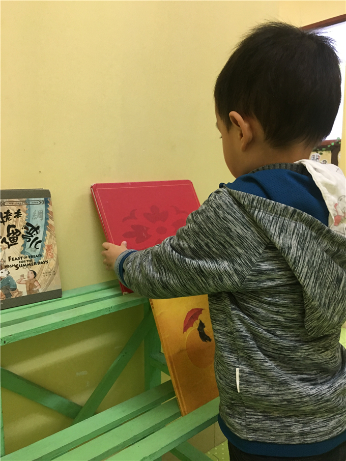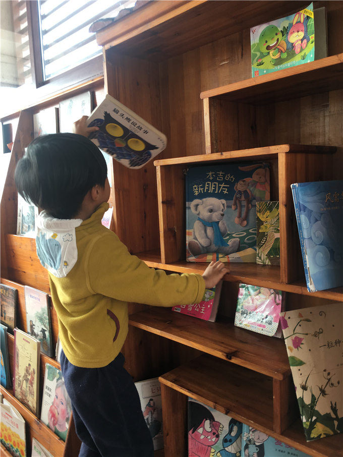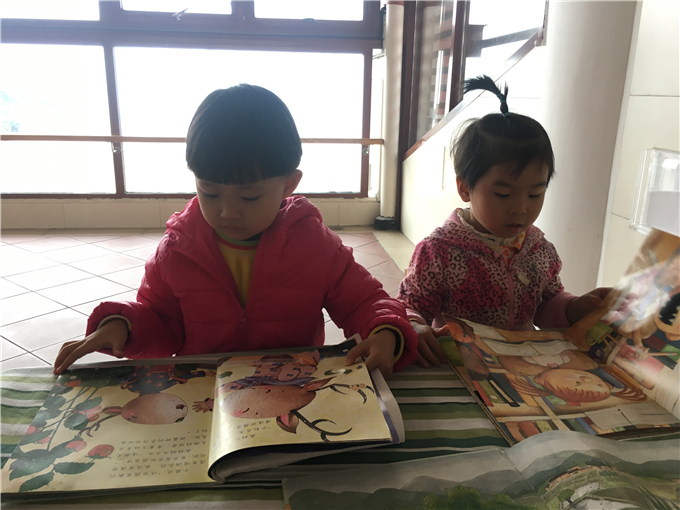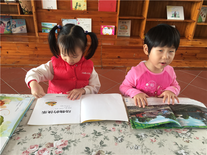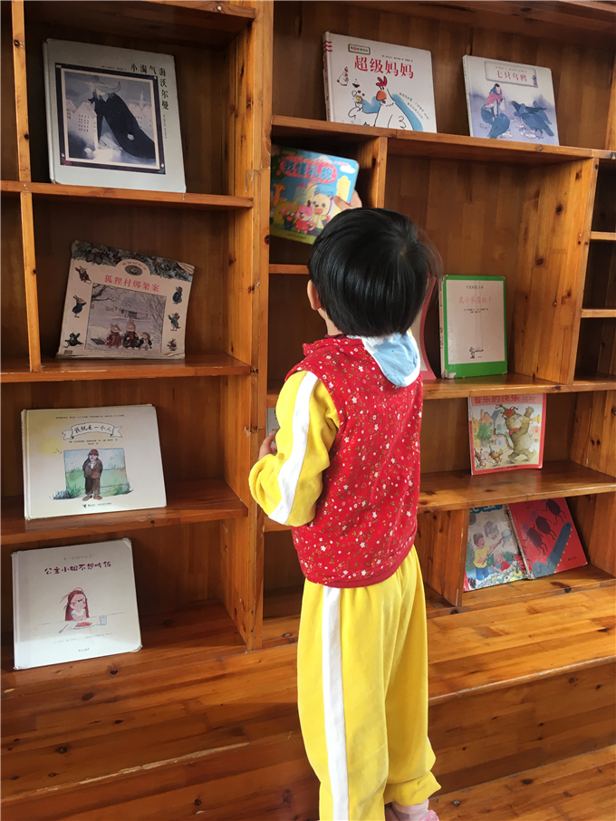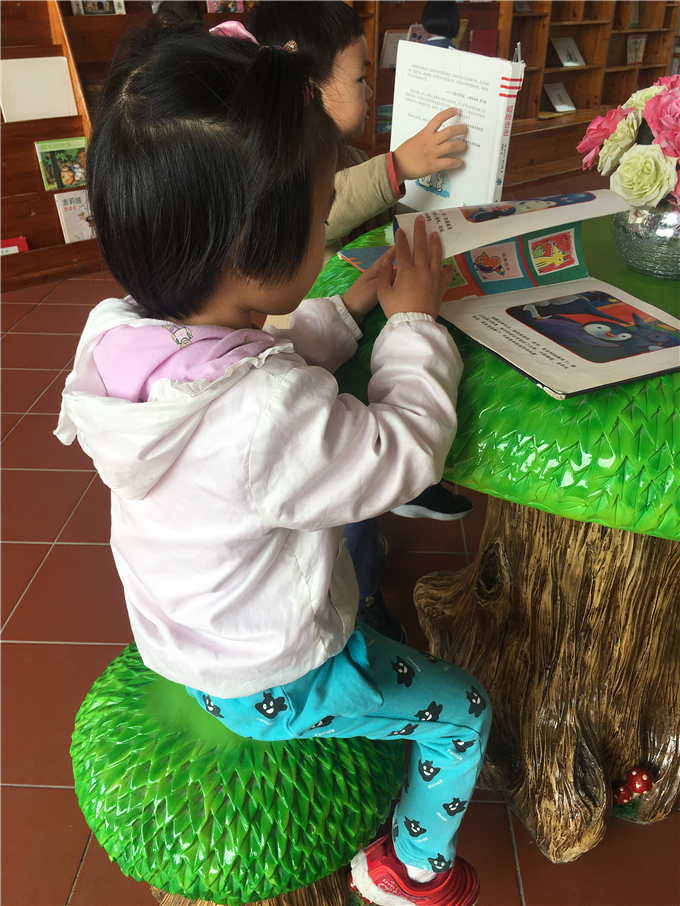 “小山庄”里有“小松鼠的家”、大桌子等等让小朋友们和伙伴们正真投入书的“森林”。快看,“源源,我喜欢的书在这层呢!”“麟麟我也拿到我喜欢的书了!”