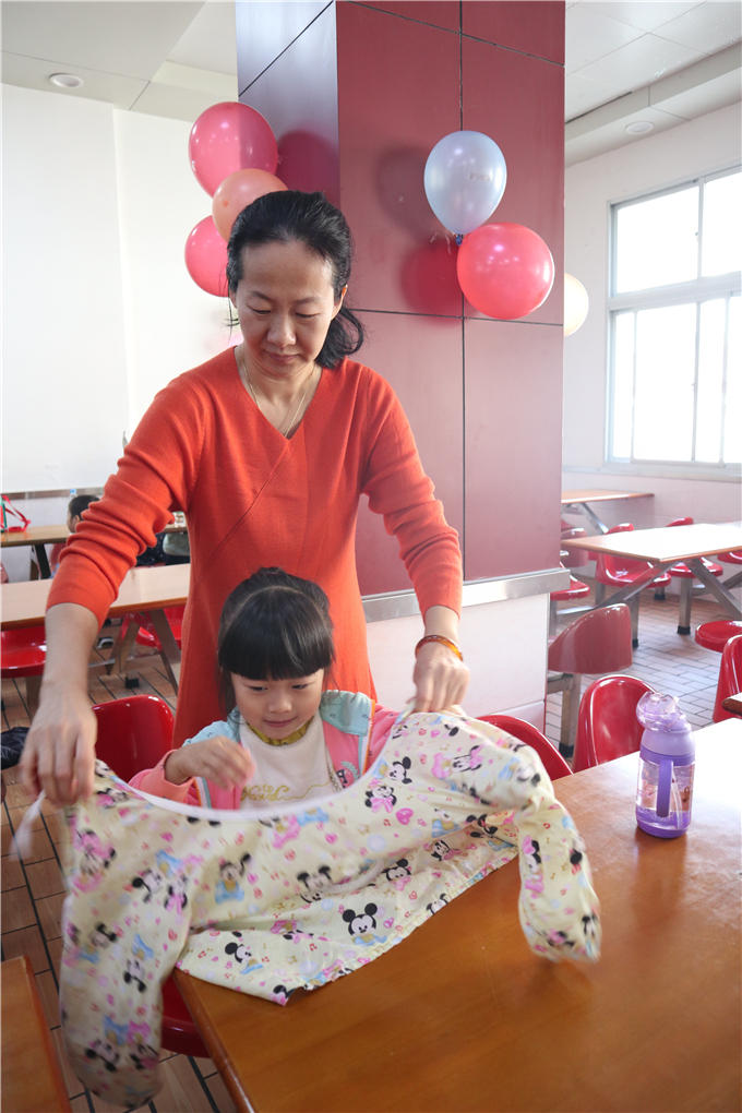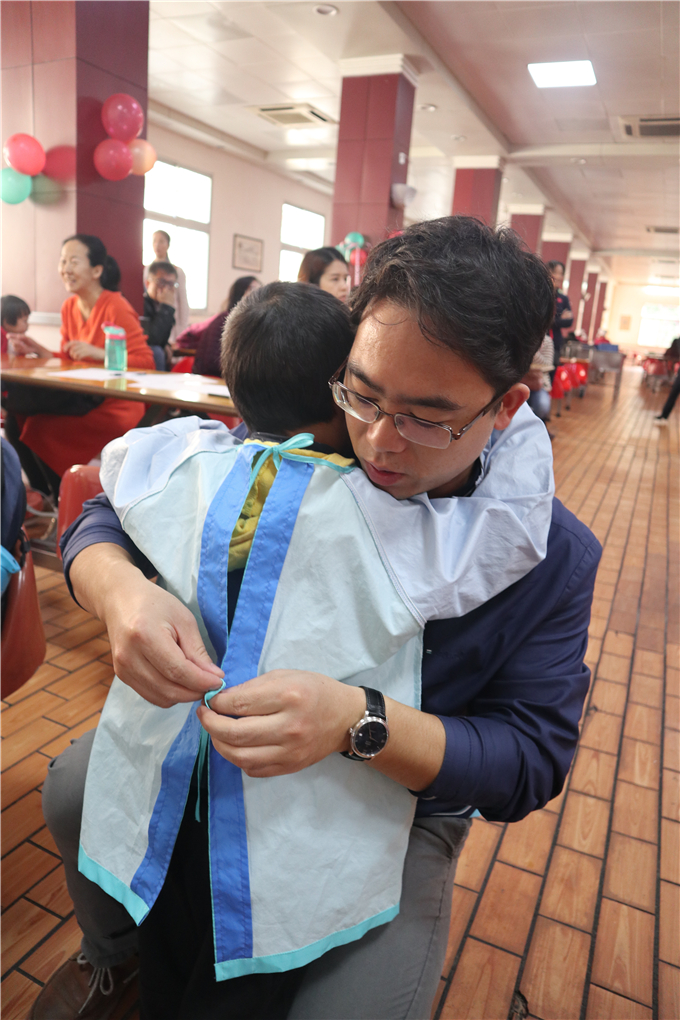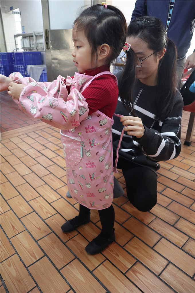 了解完了冬至的小知识,我们准备开始搓汤圆咯。不过,开始前,需要请爸爸妈妈帮忙穿一下我的“装备”,防止把衣服弄脏了。