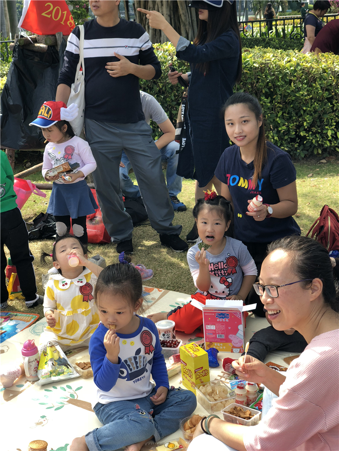 欢乐过后,萌娃们在草地上席地而坐,分享自家准备好的美味食物。