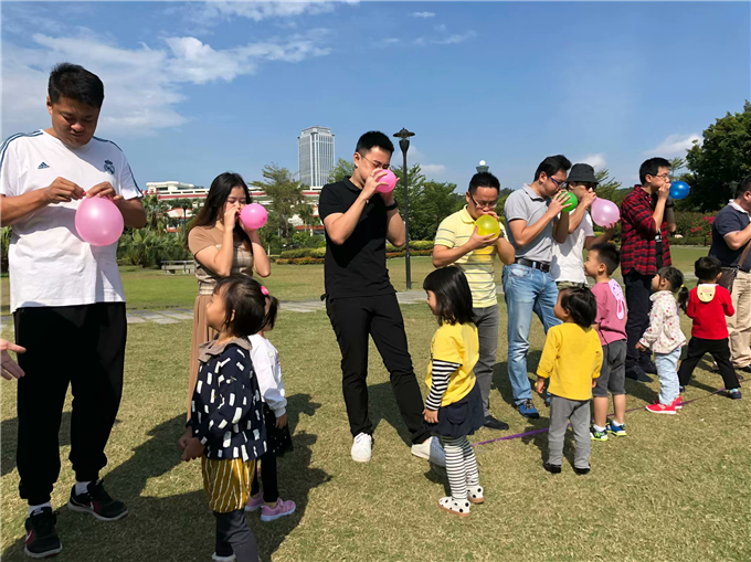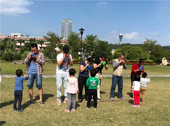 在萌娃们崇拜的目光中宝爸宝妈们鼓足力气用力吹。亲子合作把吹满欢乐的气球送到终点去。