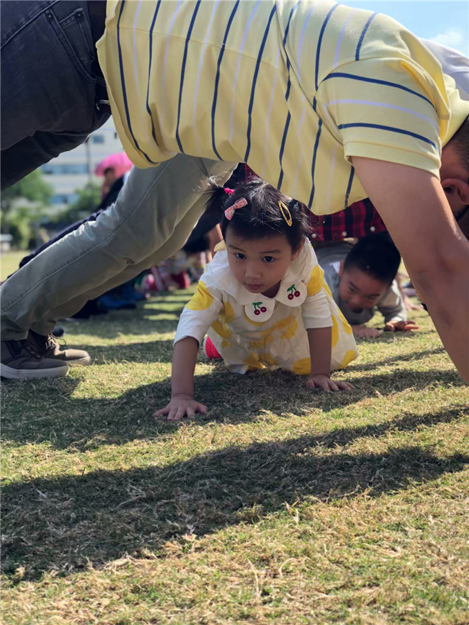 在快乐的太阳伞热身活动后,轮到小七爸爸们的表现时间。只见一个个平日里高大的爸爸们为了萌娃们的游戏伏地弯腰变身“山洞”,呜呜呜......小七班的火车出发喽,喀嚓、喀嚓钻过爸爸用身体搭起的长长山洞,“这是我钻过最特别的一个山洞了!”“嗯嗯,有爸爸的味道,哈哈”