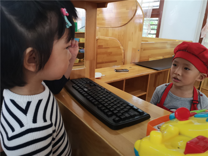 甜品屋里,出现了一位围着围裙、戴着帽子的服务生。他们正忙里忙外的为小四班的小客人们准备着可口诱人的美食,正等着弟弟妹妹的到来呢!服务生耐心的向小客人介绍着店里的美食,而小小客人也非常专心地听着他们的介绍。