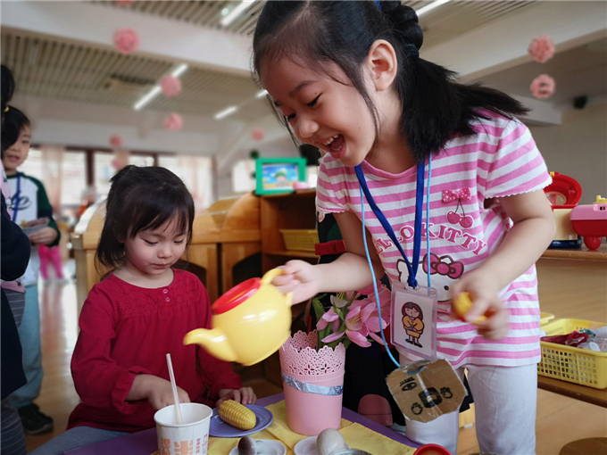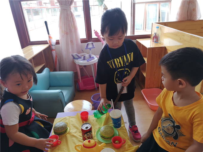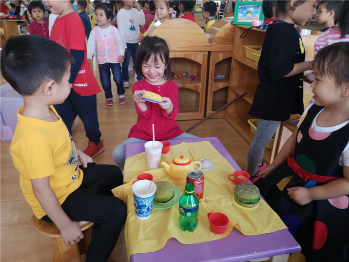 “欢迎你们来我们家做客!快坐下喝杯茶。”娃娃家里的妈妈正热情的招待着今天的小客人们,一边倒茶一变递上了刚出炉的烤玉米,小客人们都乐坏了。